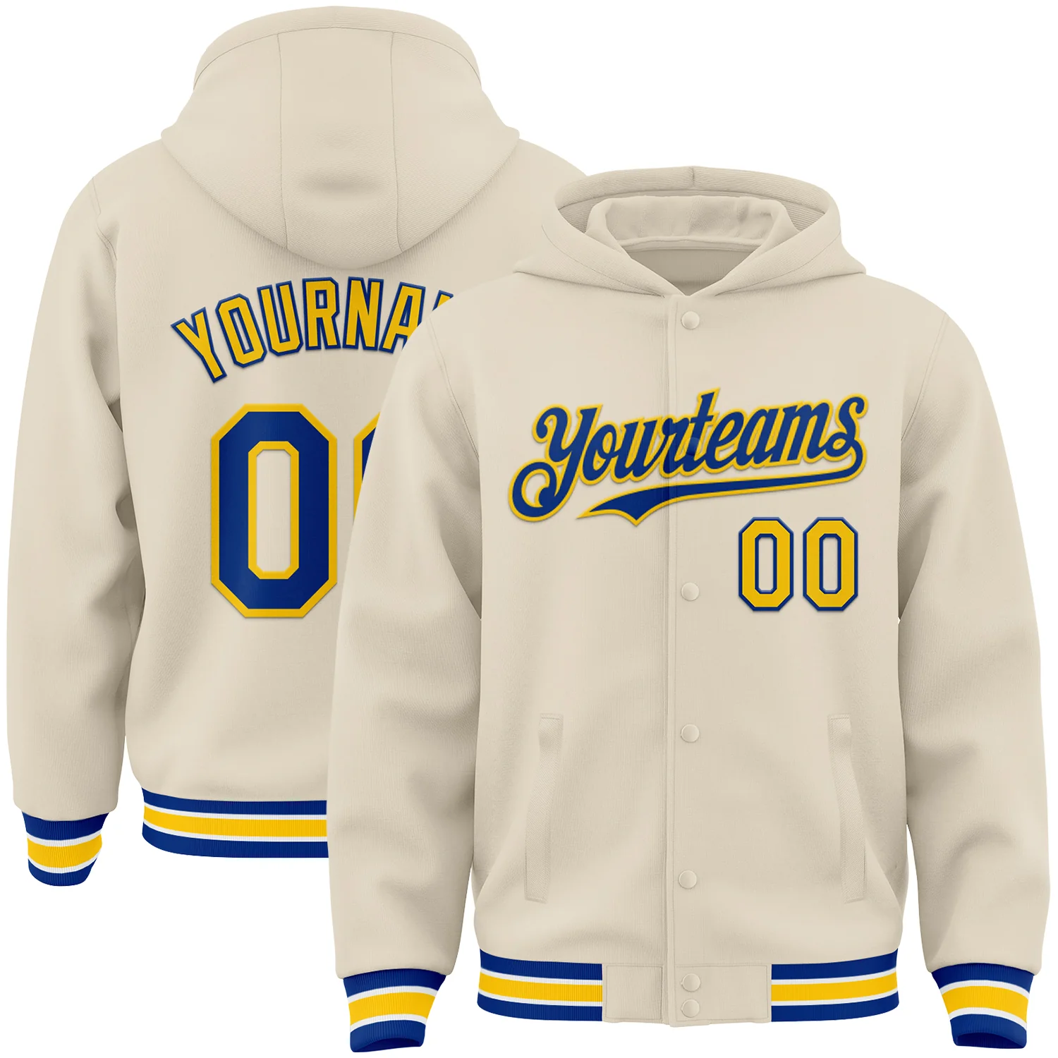 Custom Cream Royal Yellow-White Bomber Full-Snap Varsity Letterman Hoodie Jacket
