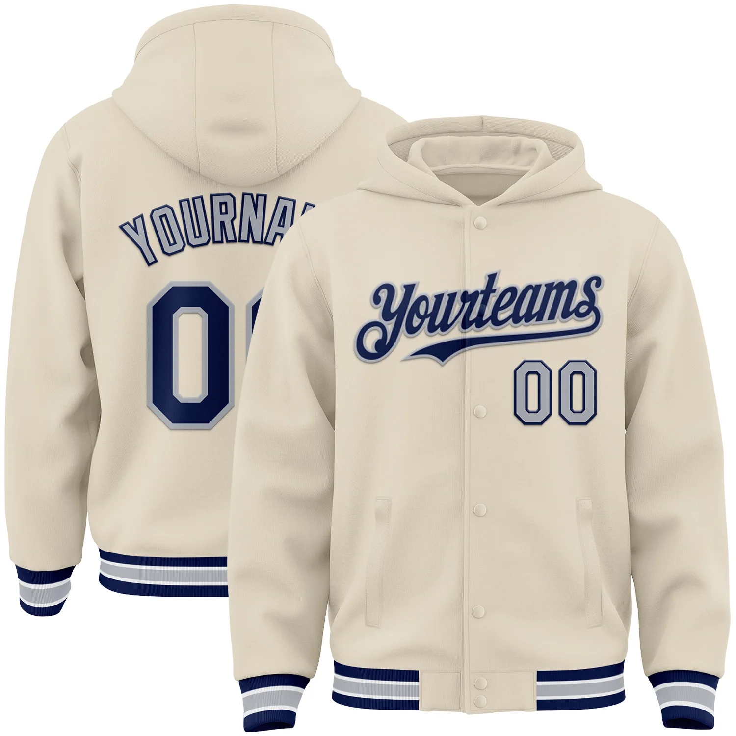 Custom Cream Navy Gray-White Bomber Full-Snap Varsity Letterman Hoodie Jacket