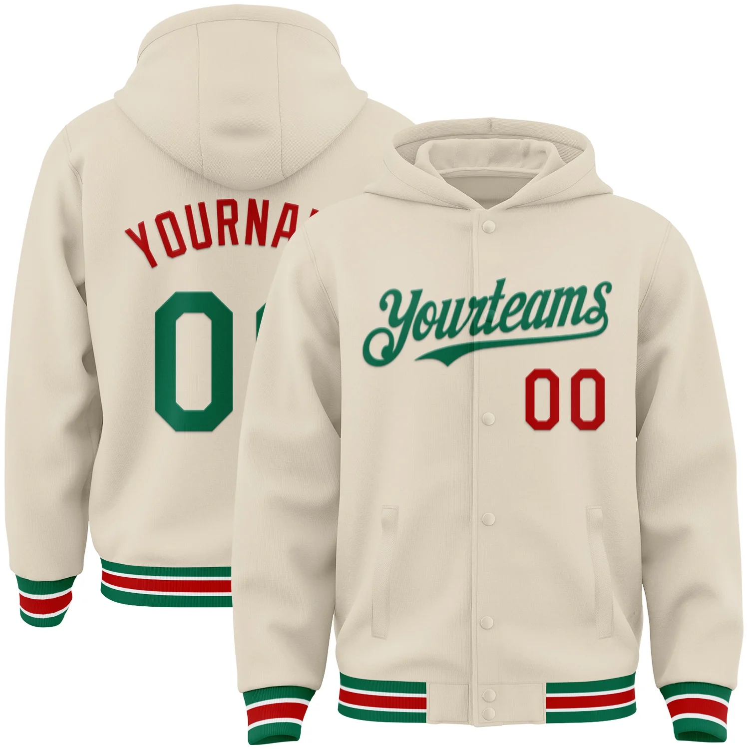 Custom Cream Kelly Green Red-White Bomber Full-Snap Varsity Letterman Hoodie Jacket