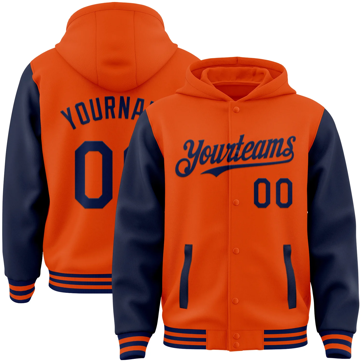 Custom Orange Navy Bomber Full-Snap Varsity Letterman Two Tone Hoodie Jacket