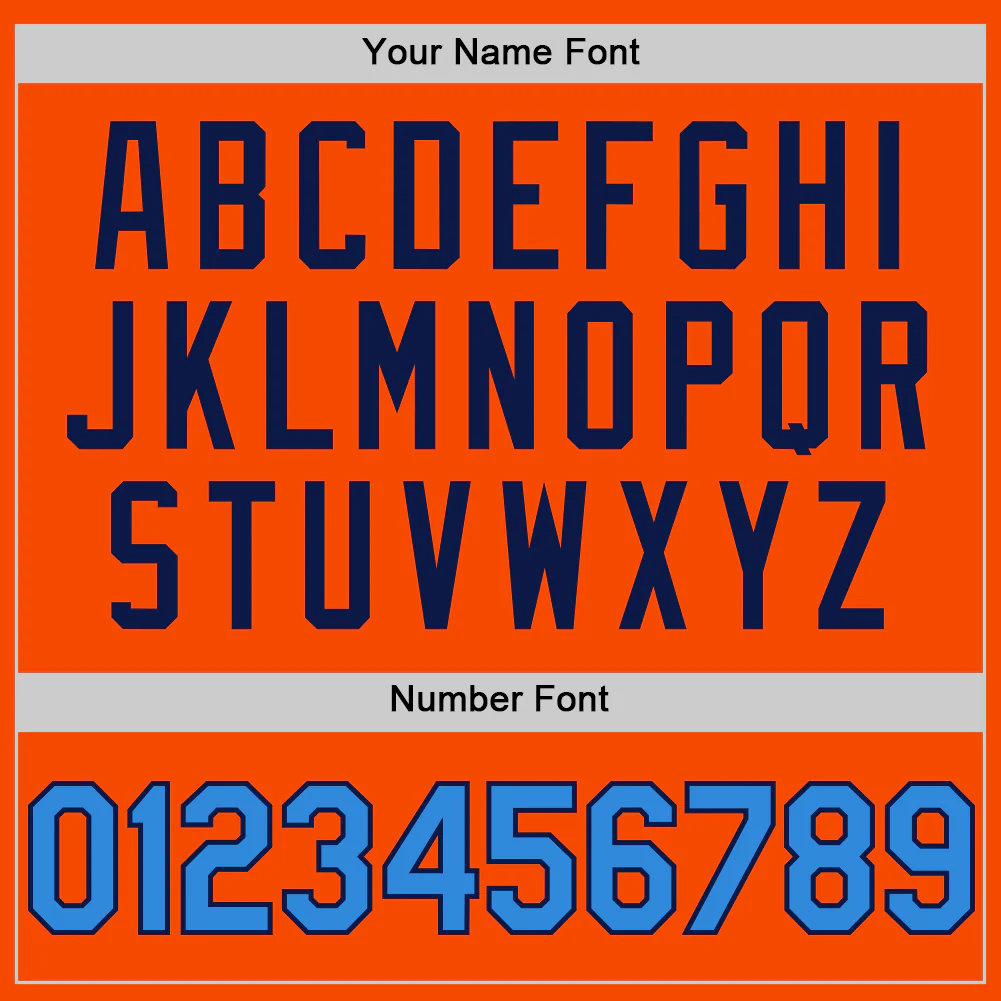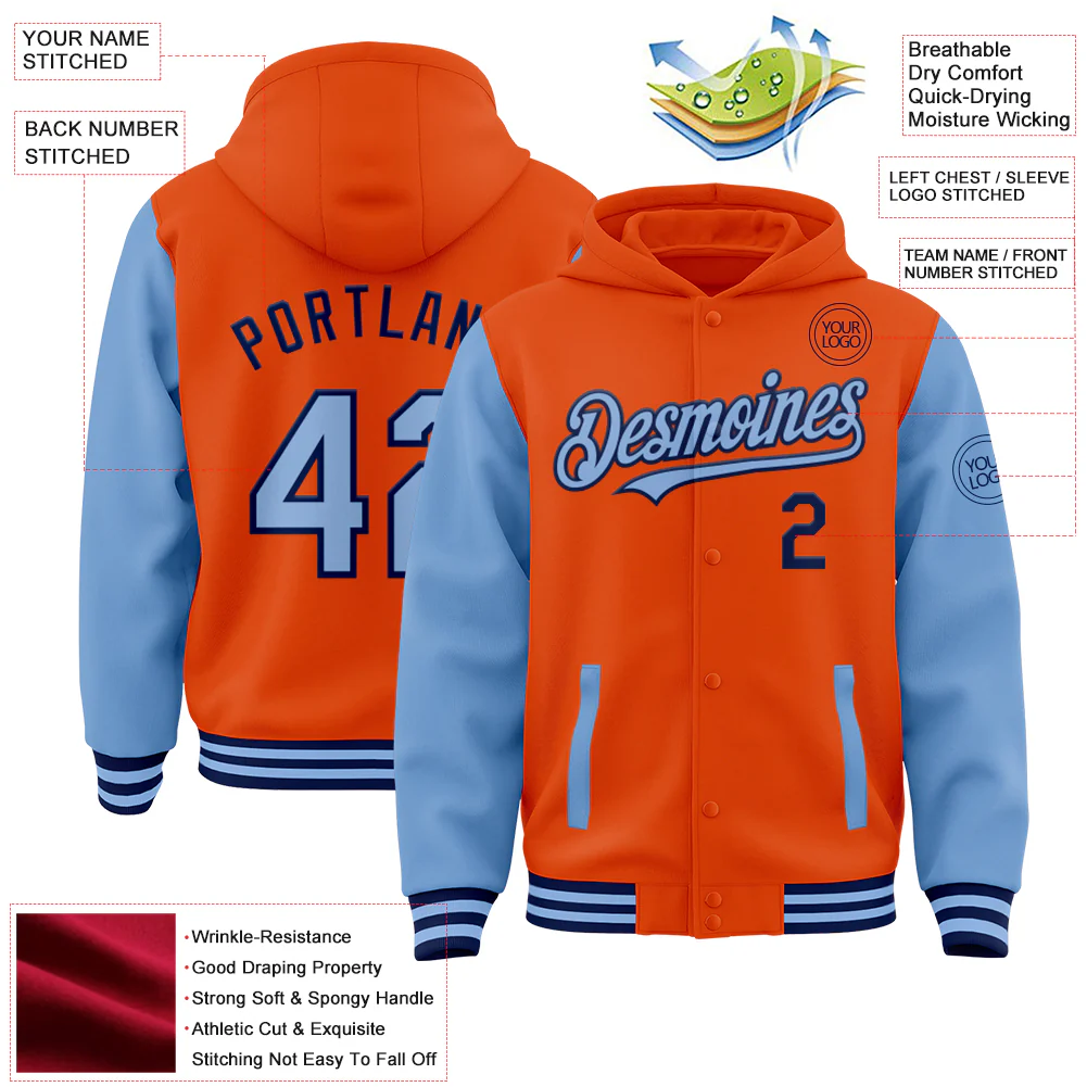 Custom Orange Light Blue-Navy Bomber Full-Snap Varsity Letterman Two Tone Hoodie Jacket