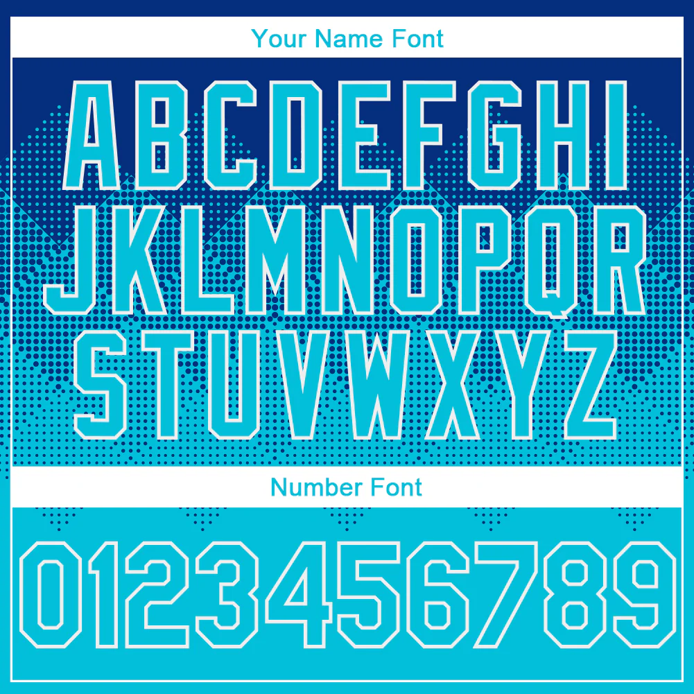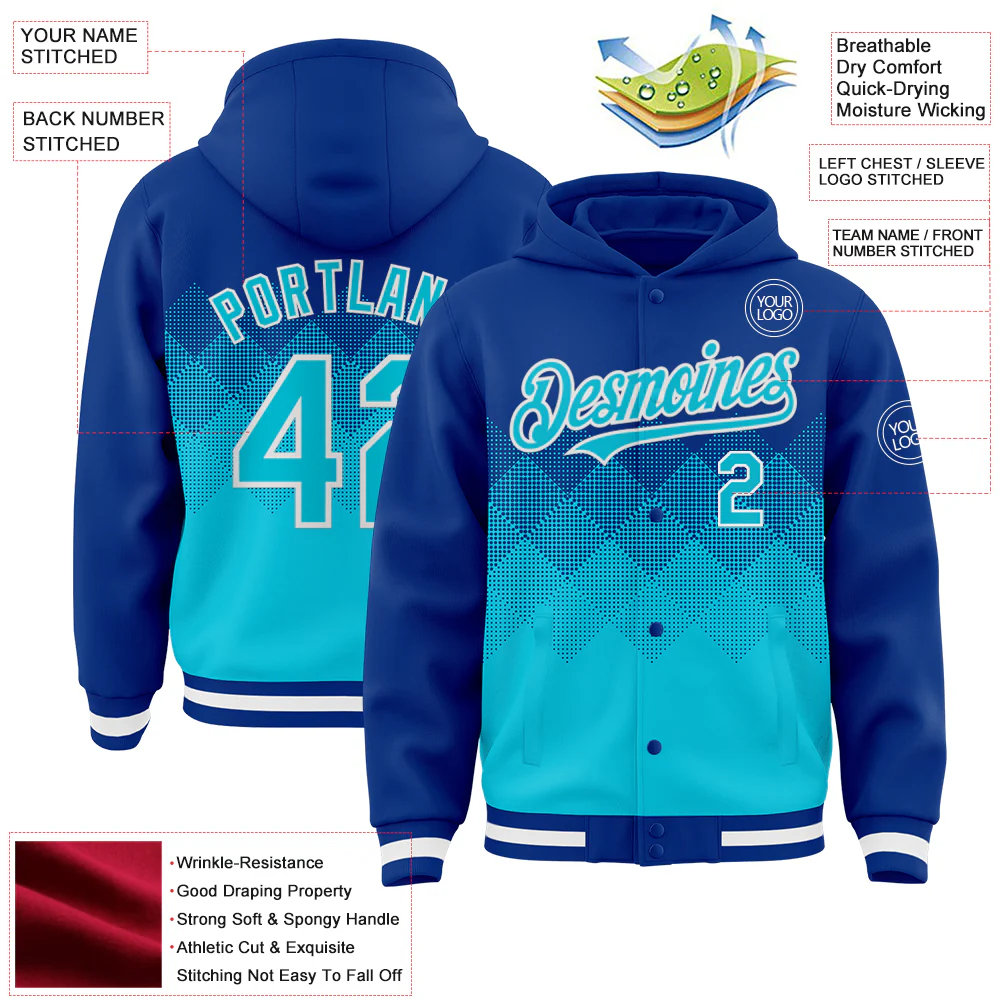 Custom Royal Light Blue-White Gradient Square Shape 3D Pattern Design Bomber Full-Snap Varsity Letterman Hoodie Jacket