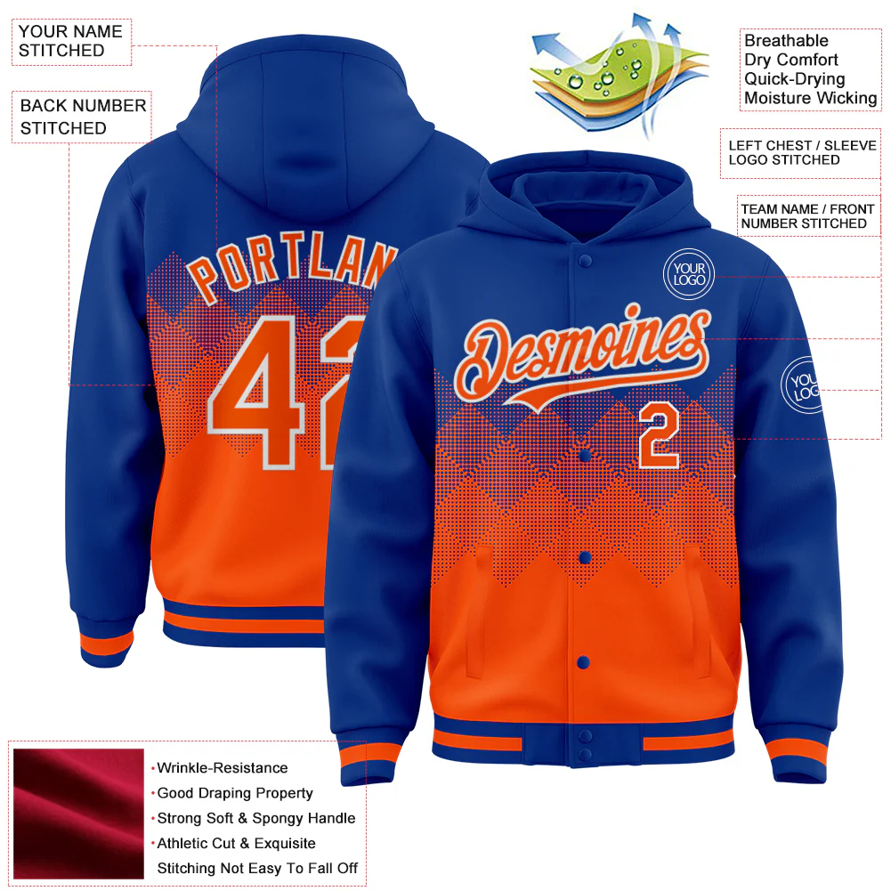 Custom Royal Orange-White Gradient Square Shape 3D Pattern Design Bomber Full-Snap Varsity Letterman Hoodie Jacket