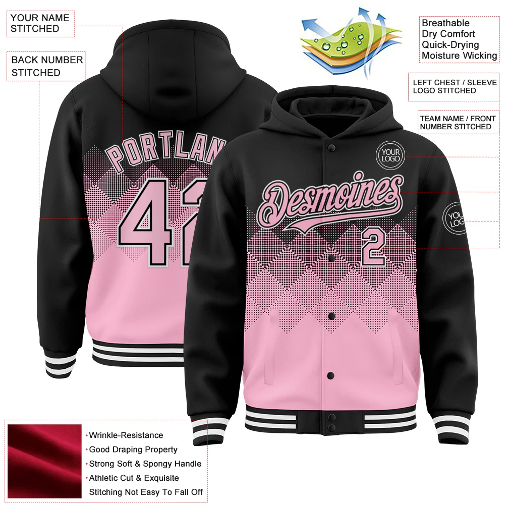 Custom Black Light Pink-White Gradient Square Shape 3D Pattern Design Bomber Full-Snap Varsity Letterman Hoodie Jacket