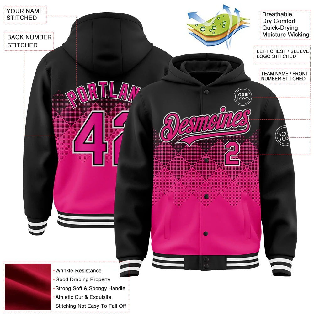 Custom Black Hot Pink-White Gradient Square Shape 3D Pattern Design Bomber Full-Snap Varsity Letterman Hoodie Jacket