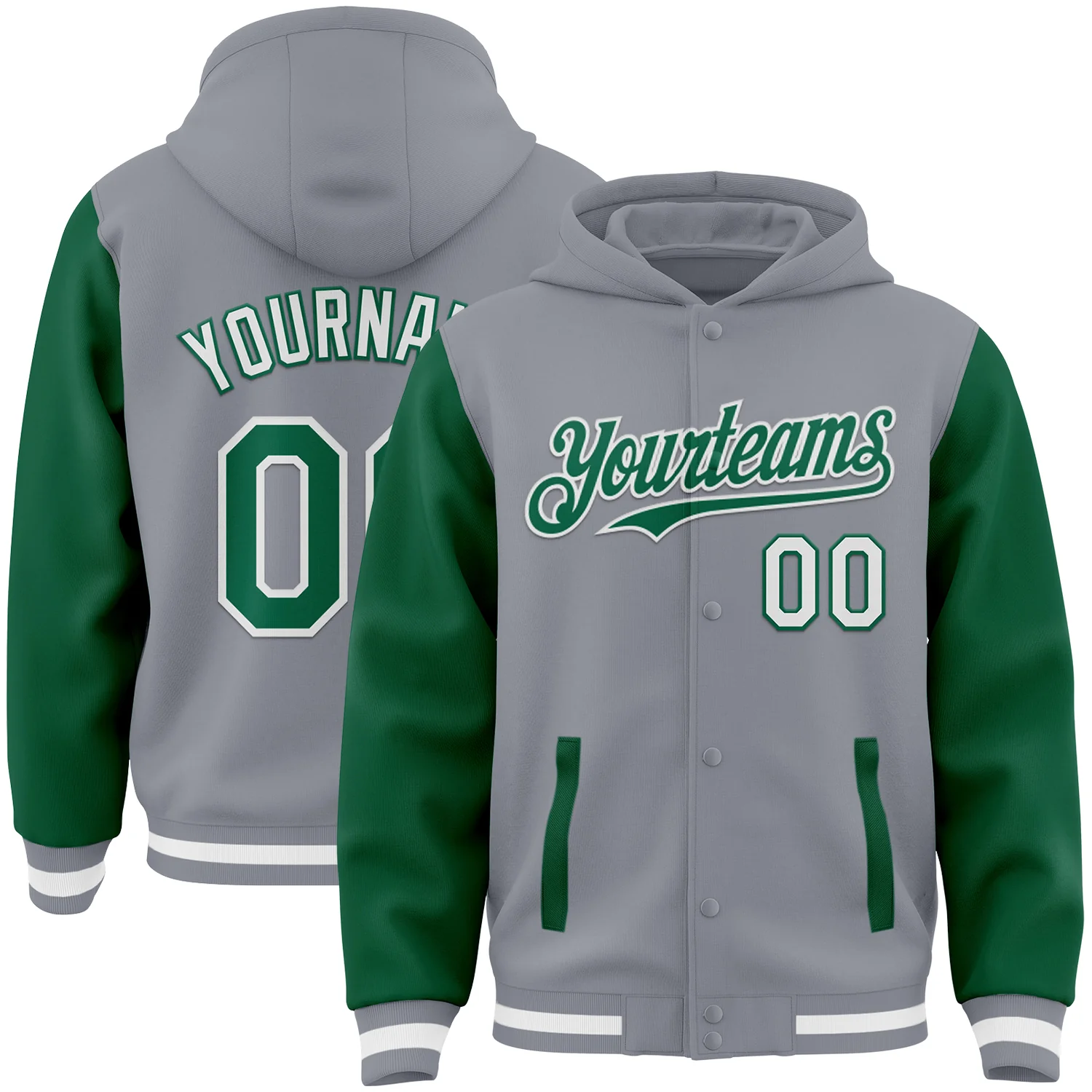 Custom Gray Kelly Green-White Bomber Full-Snap Varsity Letterman Two Tone Hoodie Jacket