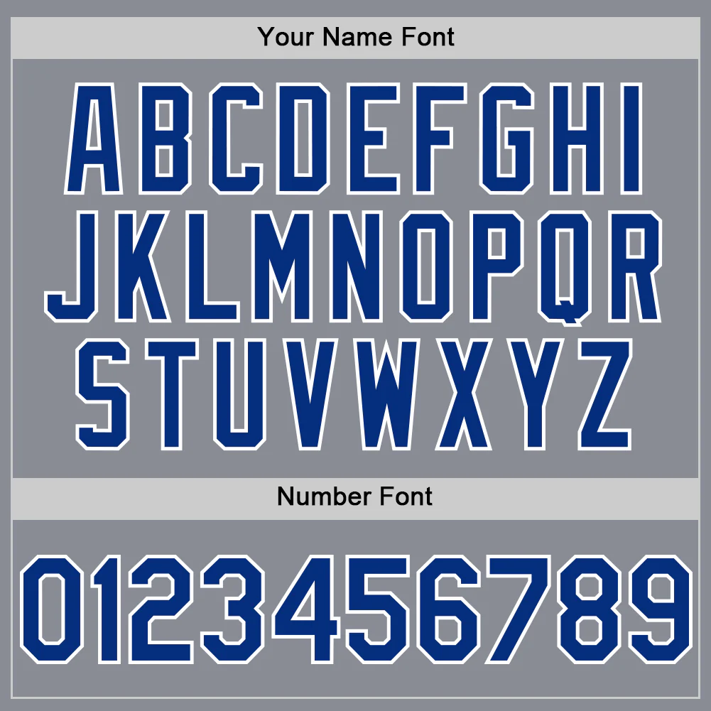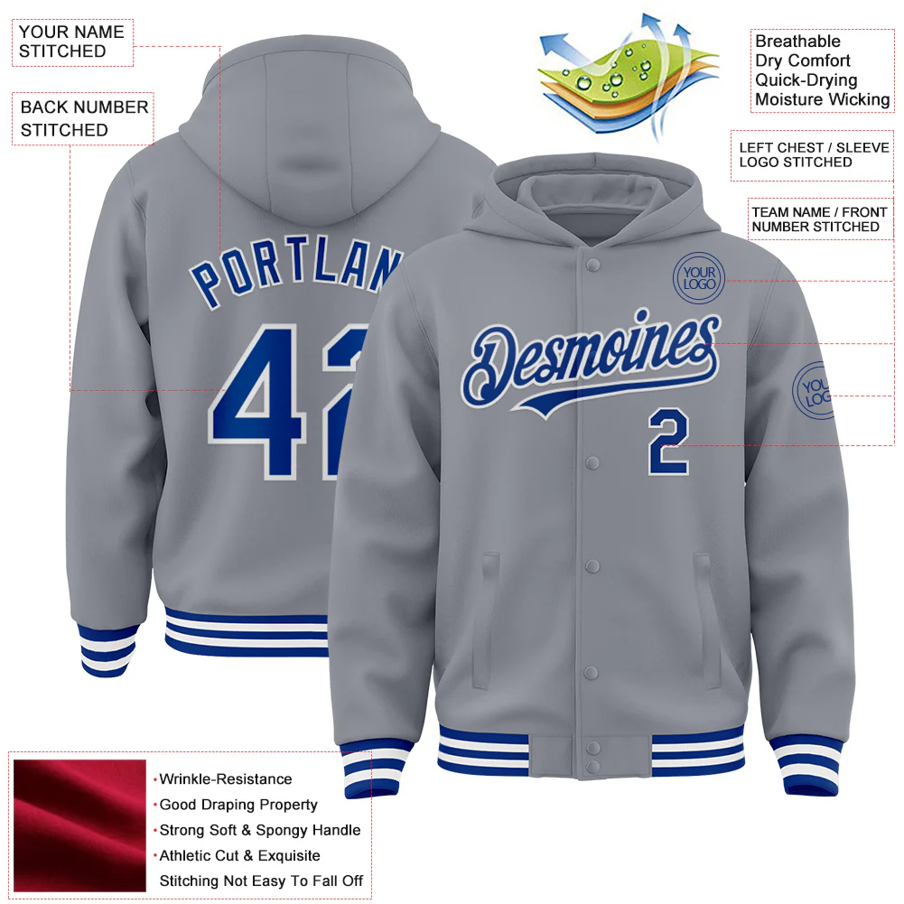 Custom Gray Royal-White Bomber Full-Snap Varsity Letterman Hoodie Jacket