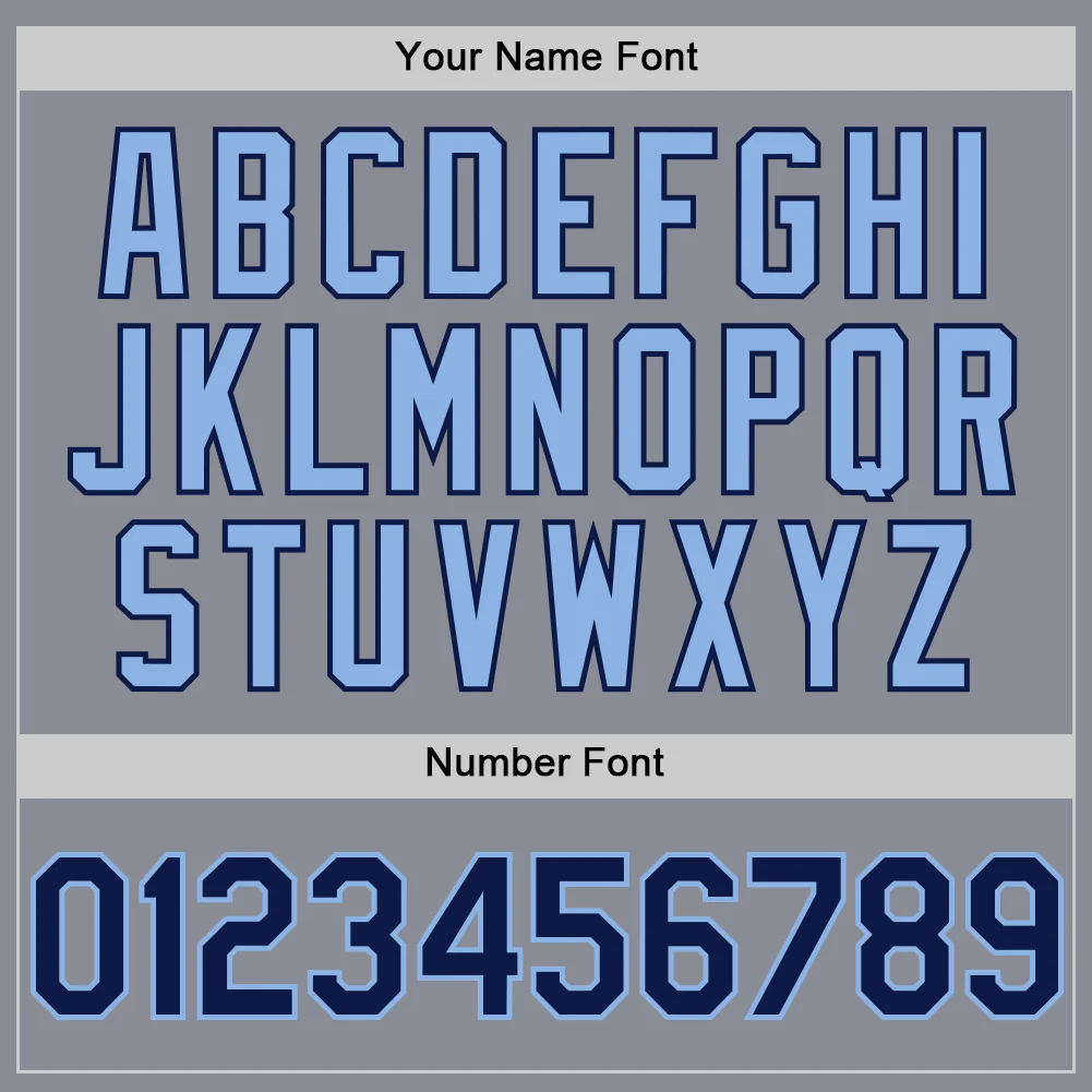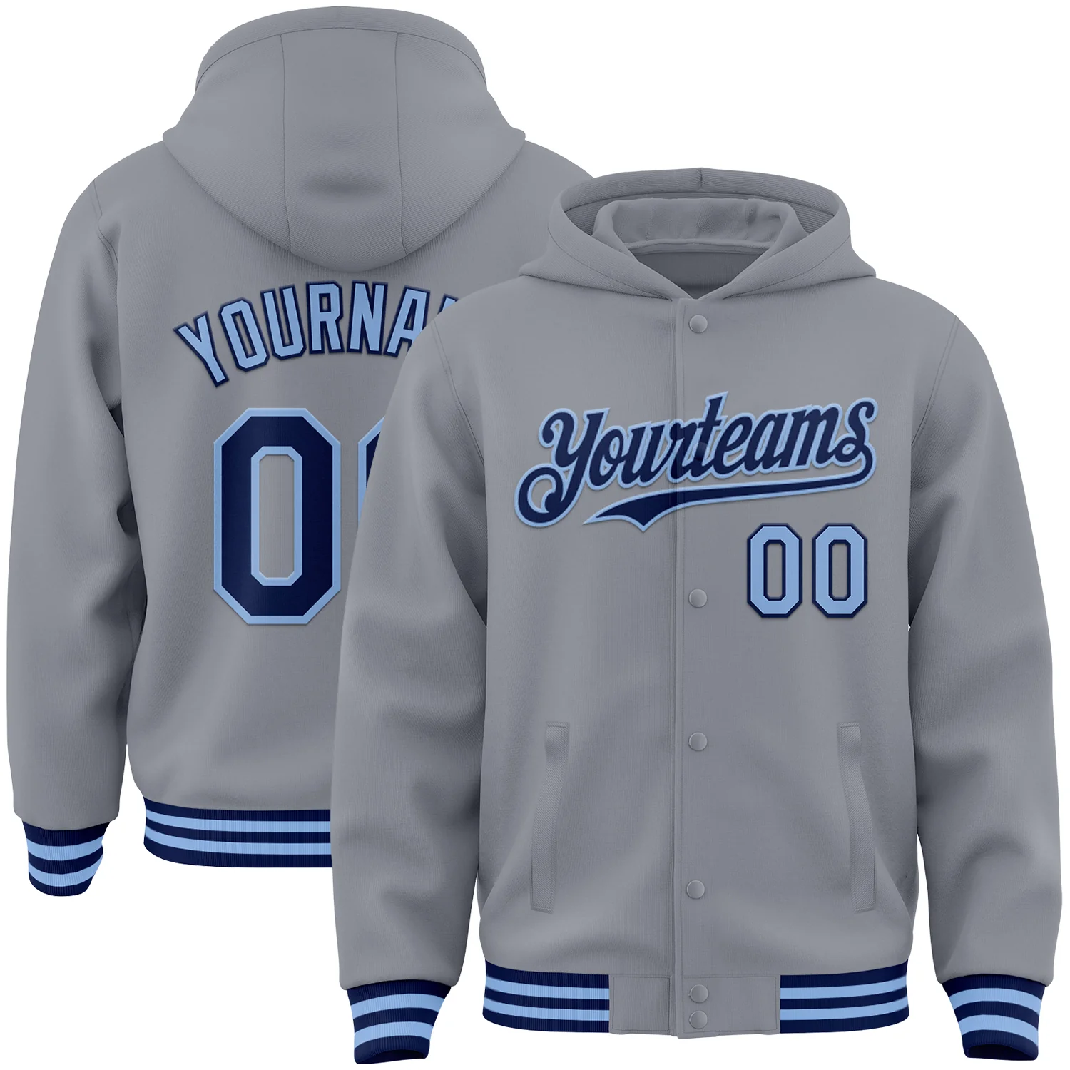 Custom Gray Navy-Light Blue Bomber Full-Snap Varsity Letterman Hoodie Jacket