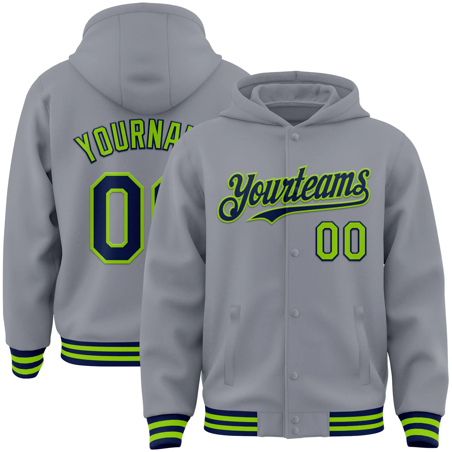 Custom Gray Navy-Neon Green Bomber Full-Snap Varsity Letterman Hoodie Jacket
