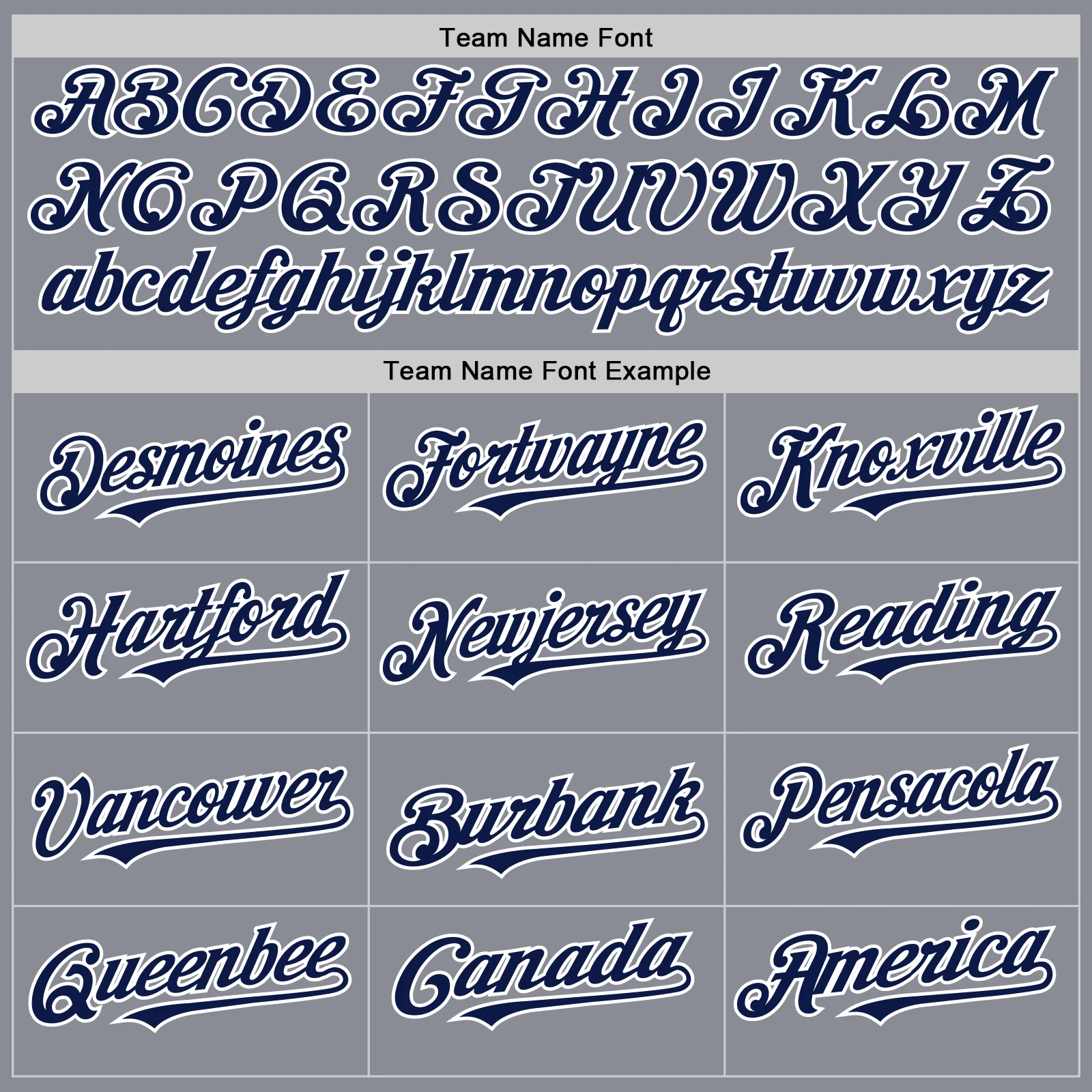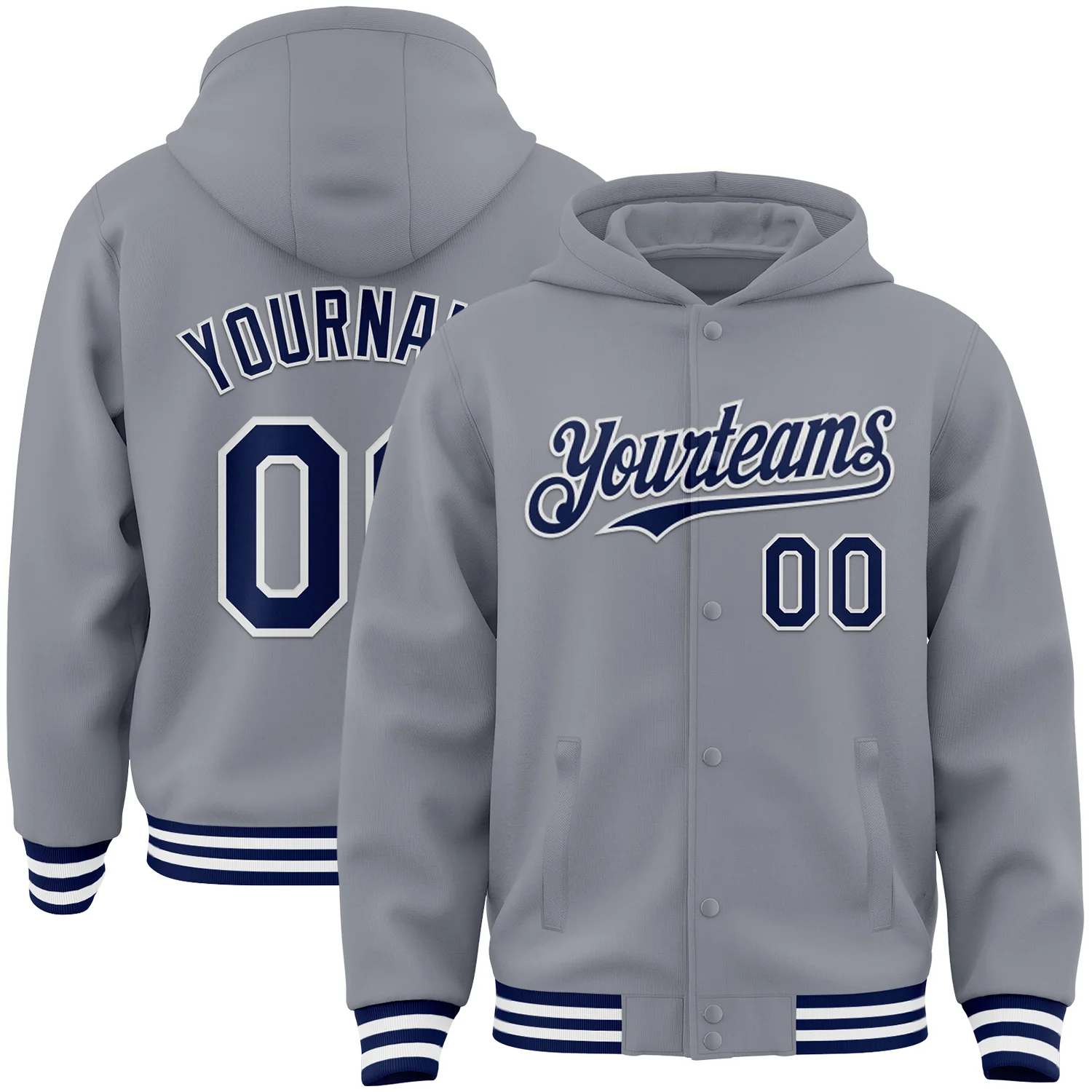 Custom Gray Navy-White Bomber Full-Snap Varsity Letterman Hoodie Jacket