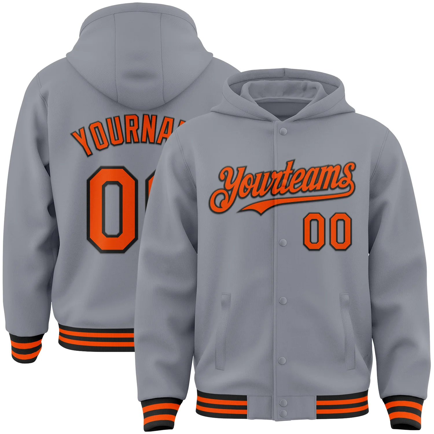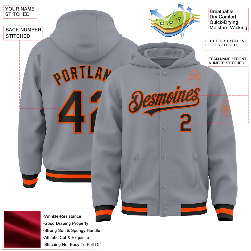 Custom Gray Orange-Black Bomber Full-Snap Varsity Letterman Hoodie Jacket