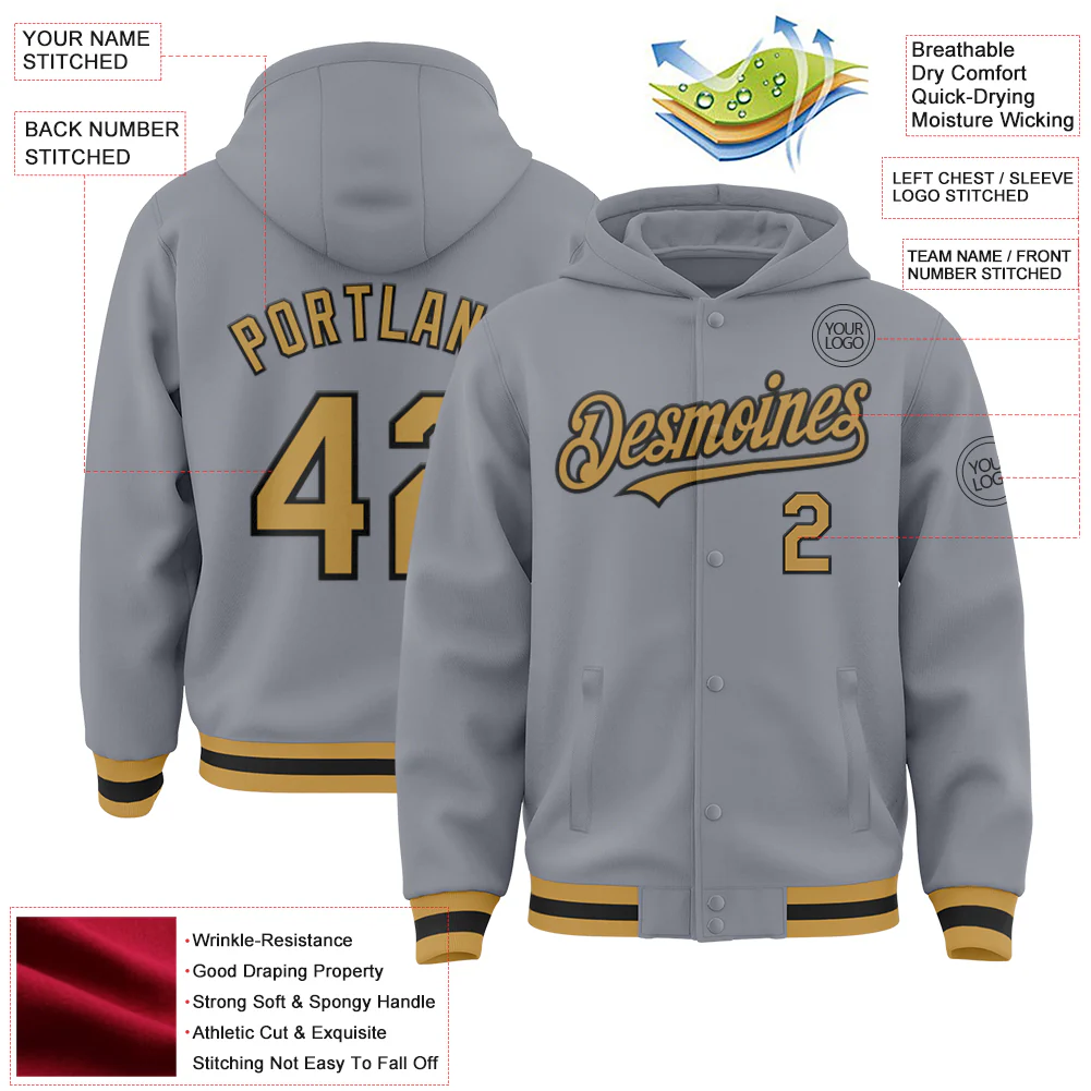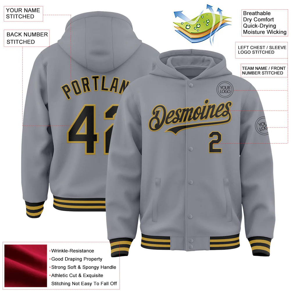Custom Gray Black-Gold Bomber Full-Snap Varsity Letterman Hoodie Jacket