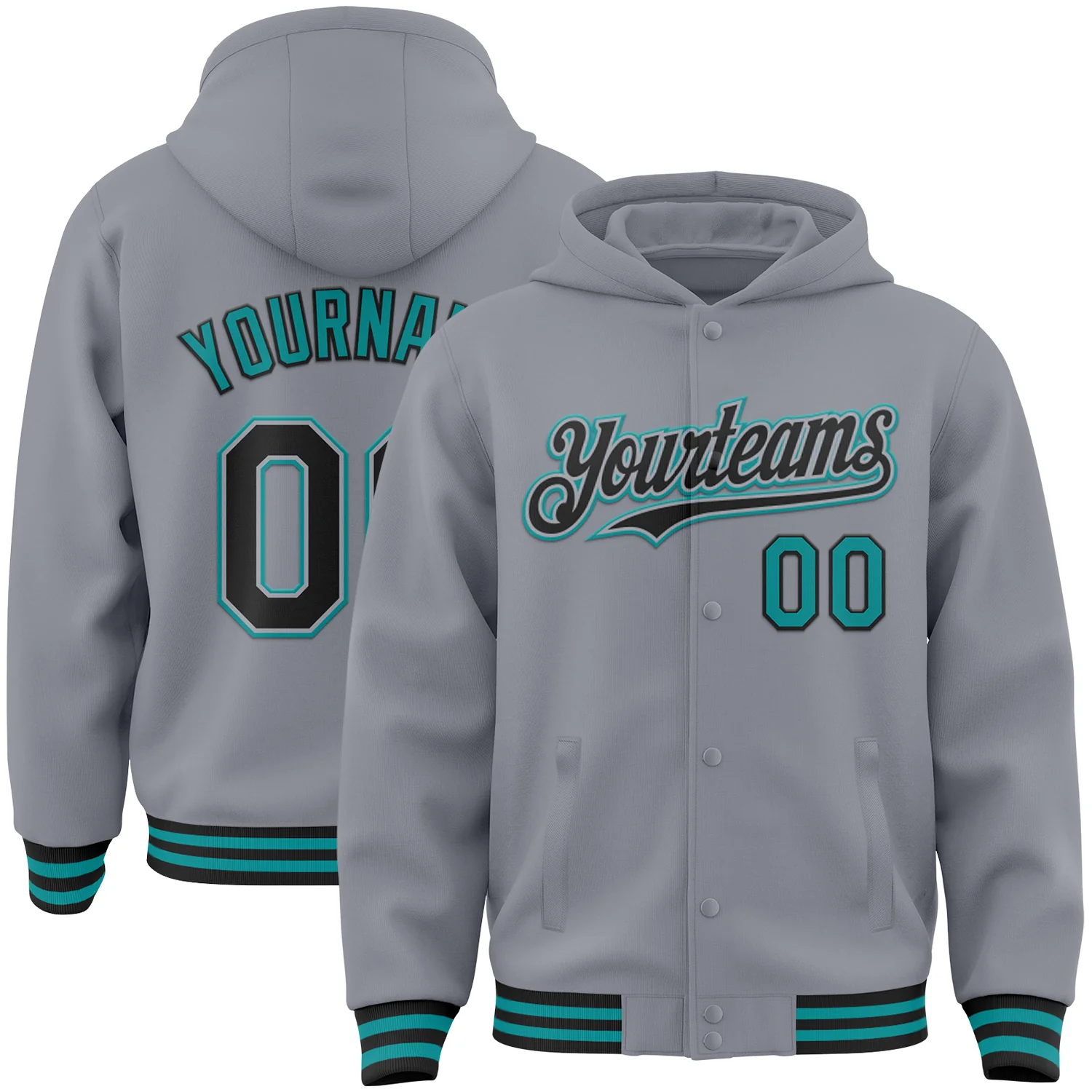 Custom Gray Black-Teal Bomber Full-Snap Varsity Letterman Hoodie Jacket