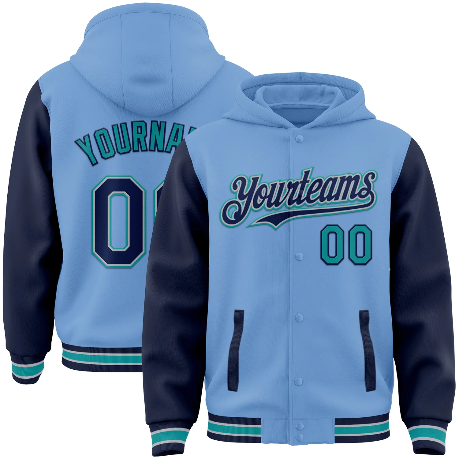 Custom Light Blue Navy Gray-Teal Bomber Full-Snap Varsity Letterman Two Tone Hoodie Jacket