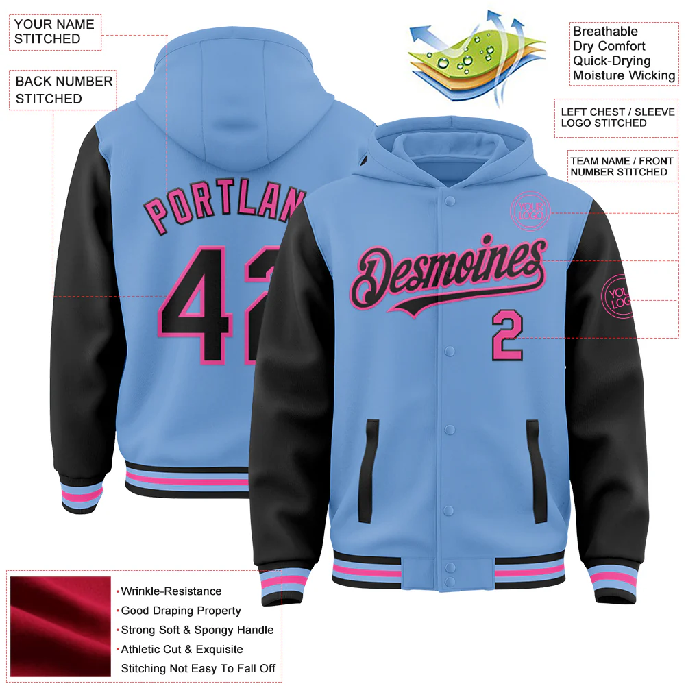 Custom Light Blue Black-Pink Bomber Full-Snap Varsity Letterman Two Tone Hoodie Jacket