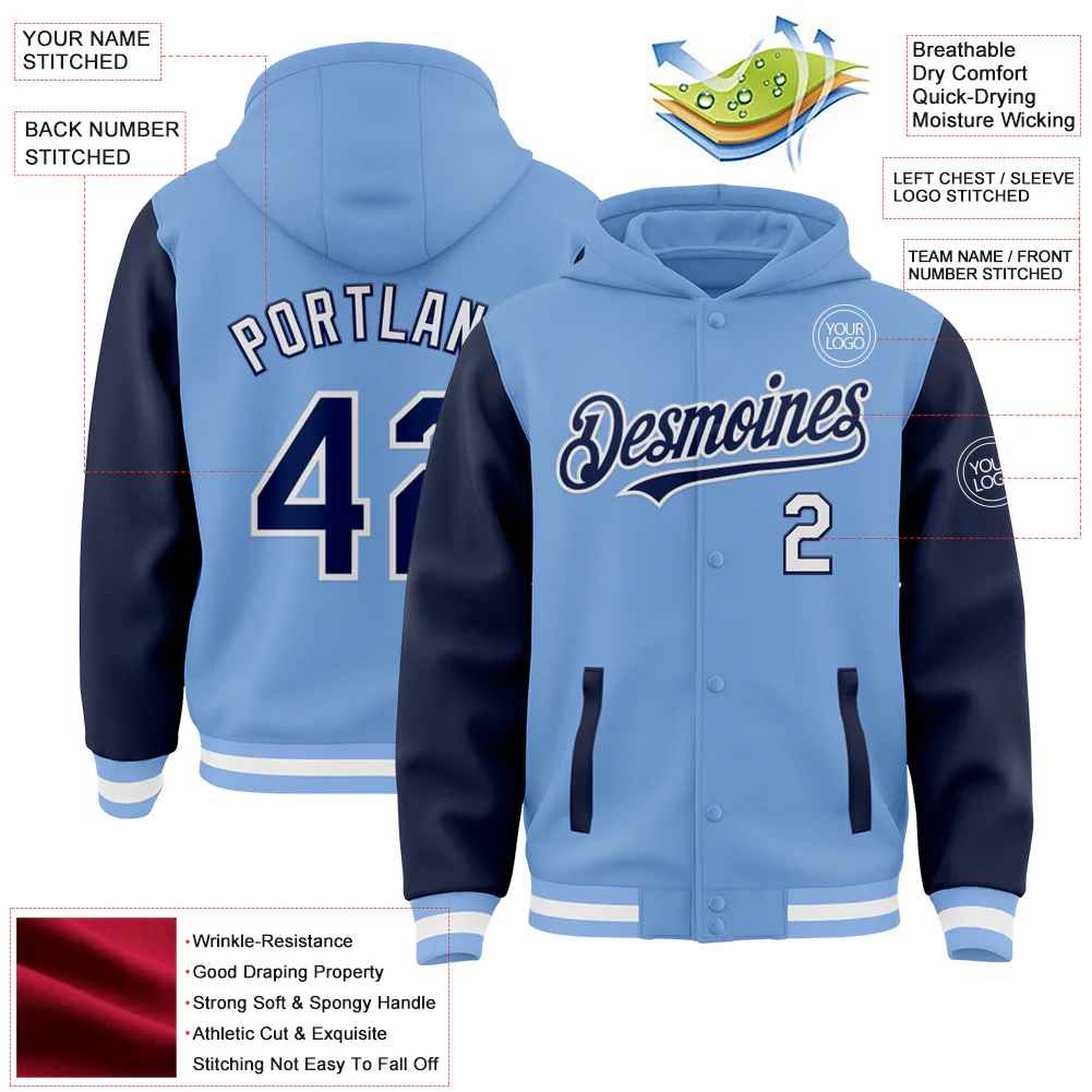 Custom Light Blue Navy-White Bomber Full-Snap Varsity Letterman Two Tone Hoodie Jacket
