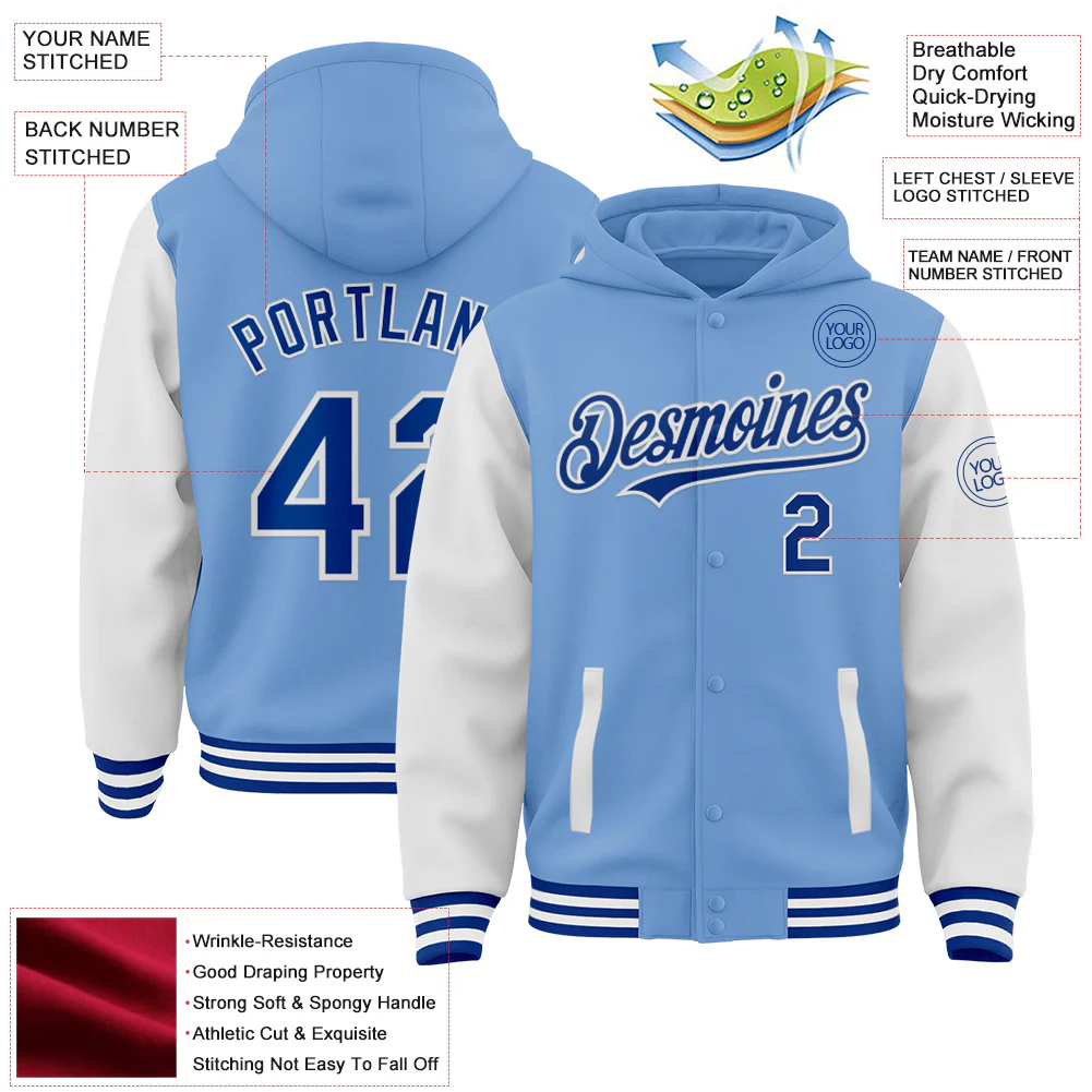 Custom Light Blue Royal-White Bomber Full-Snap Varsity Letterman Two Tone Hoodie Jacket