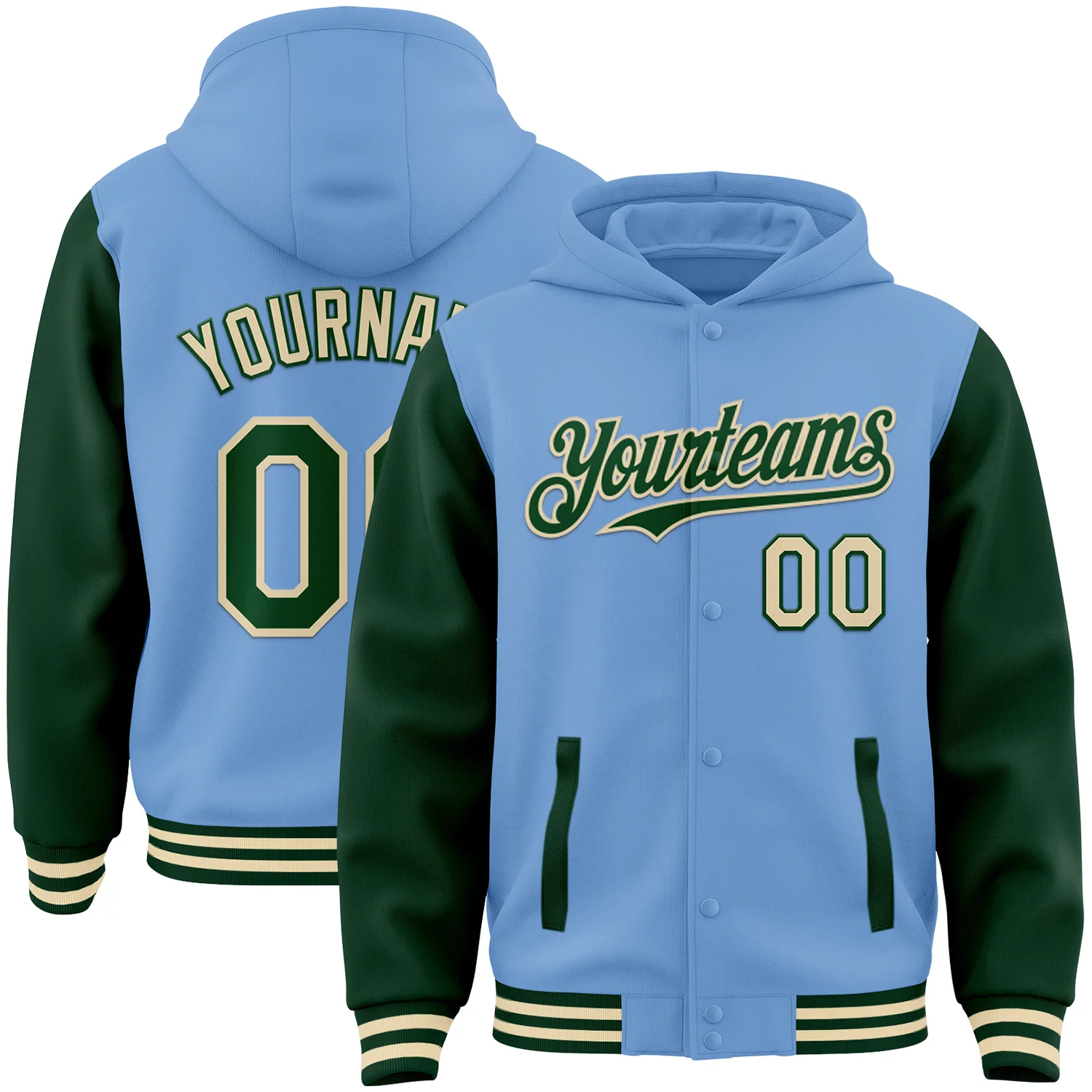 Custom Light Blue Green-Cream Bomber Full-Snap Varsity Letterman Two Tone Hoodie Jacket