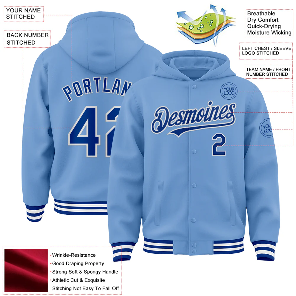 Custom Light Blue Royal-White Bomber Full-Snap Varsity Letterman Hoodie Jacket