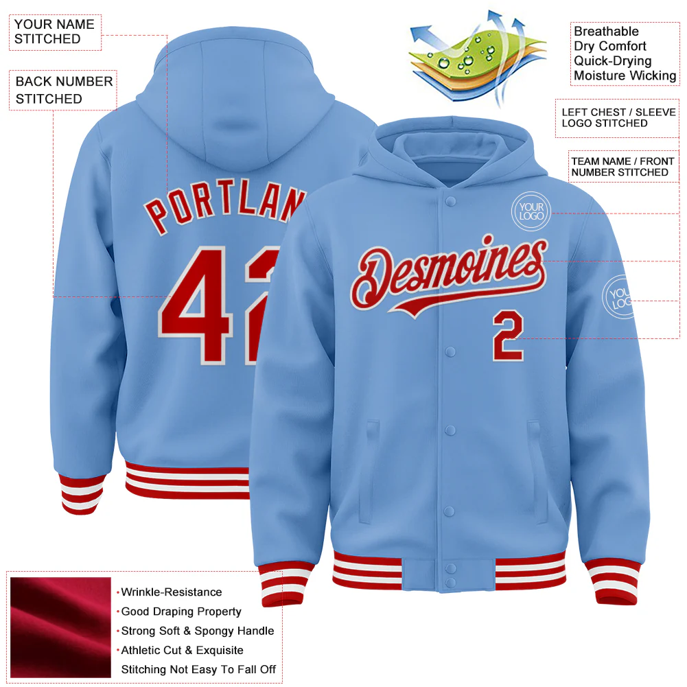Custom Light Blue Red-White Bomber Full-Snap Varsity Letterman Hoodie Jacket