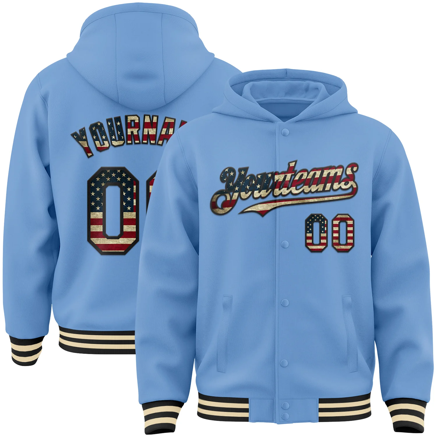Custom Light Blue Vintage USA Flag Black-Cream Bomber Full-Snap Varsity Letterman Hoodie Jacket