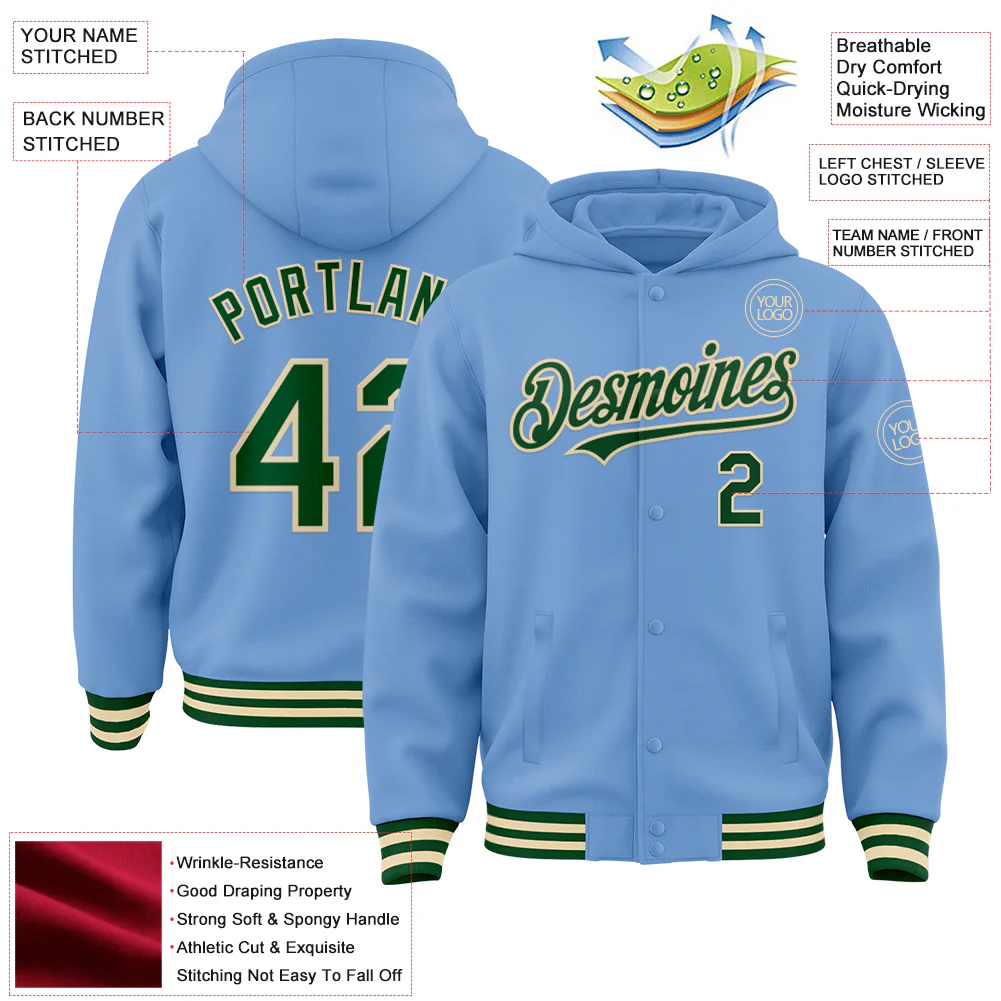 Custom Light Blue Green-Cream Bomber Full-Snap Varsity Letterman Hoodie Jacket