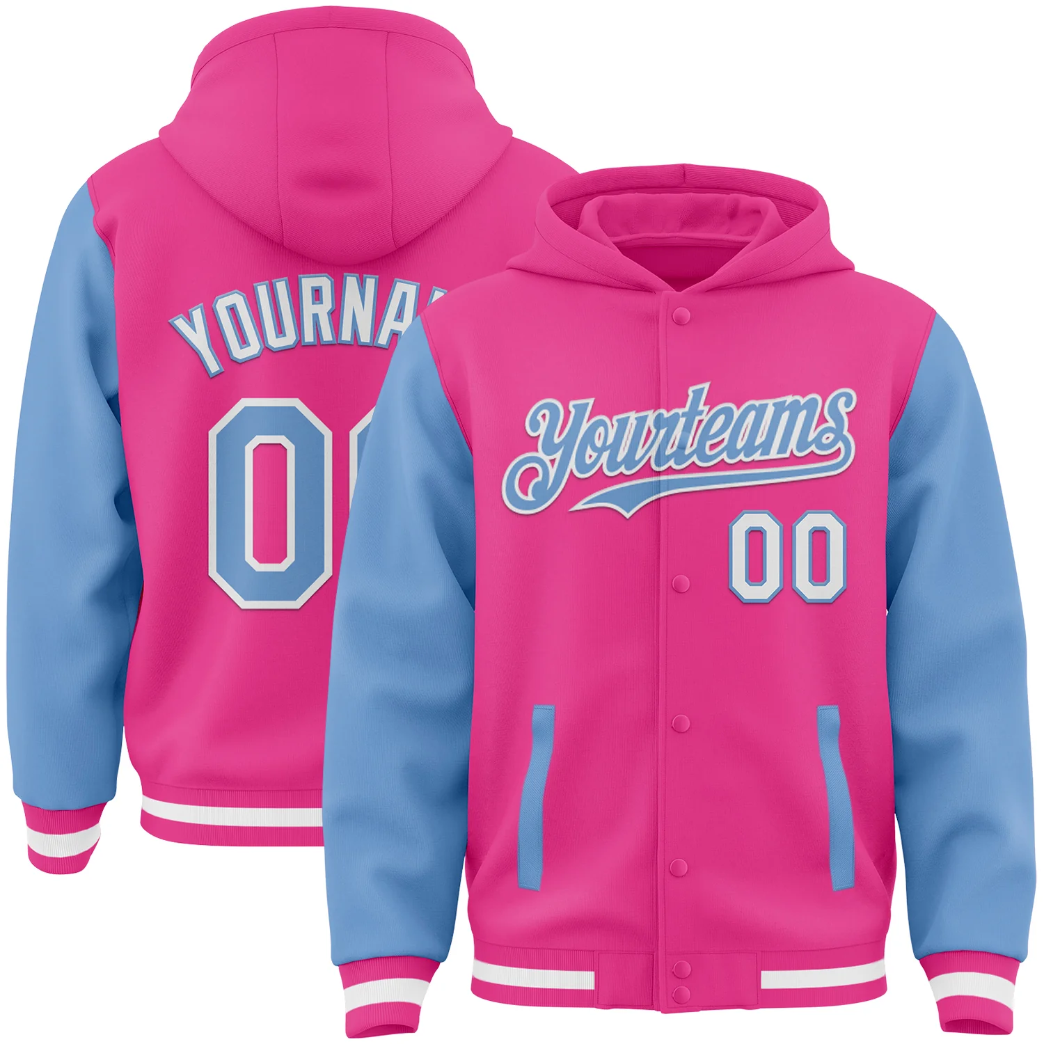 Custom Pink Black-Light Blue Bomber Full-Snap Varsity Letterman Two Tone Hoodie Jacket