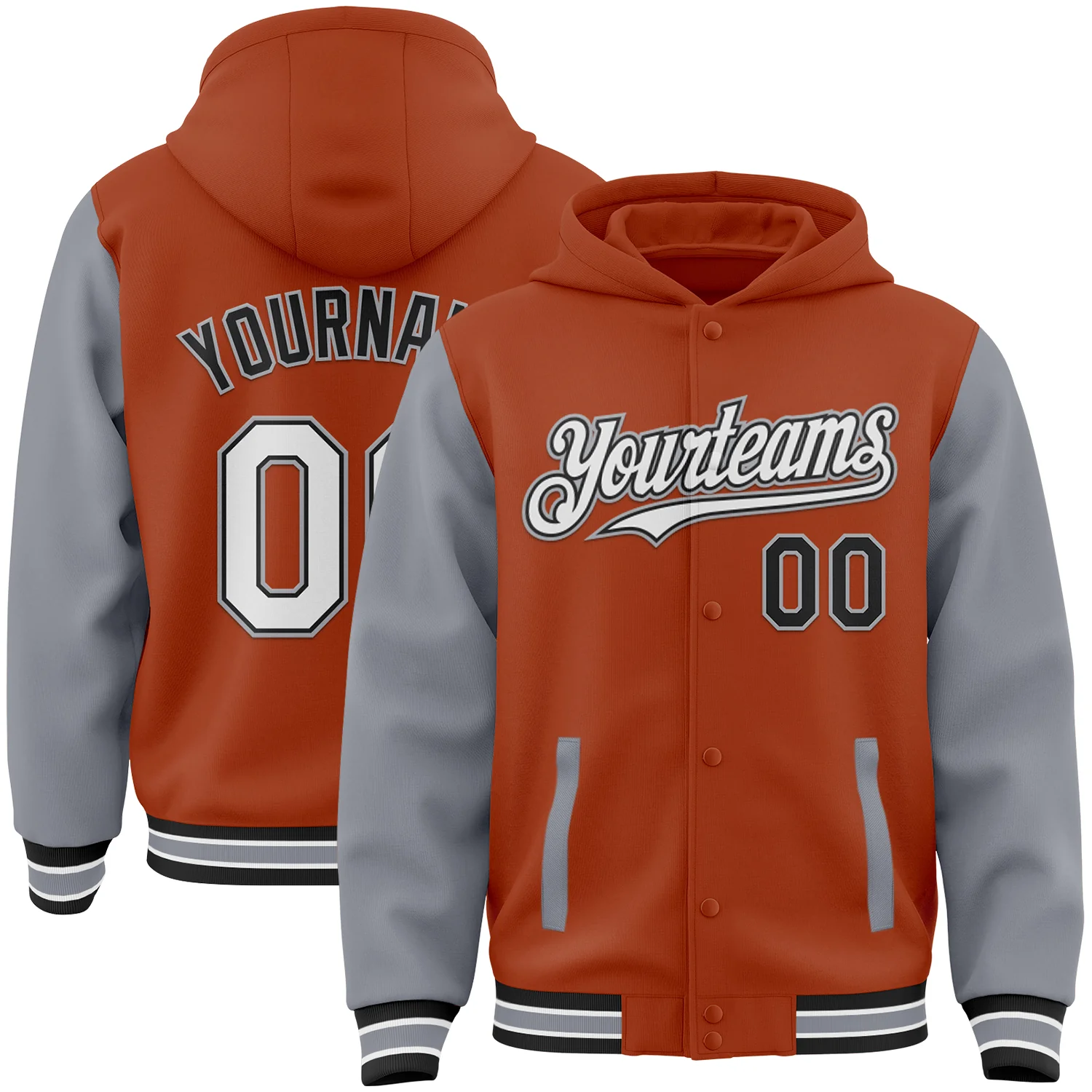 Custom Texas Orange Gray-Black Bomber Full-Snap Varsity Letterman Two Tone Hoodie Jacket