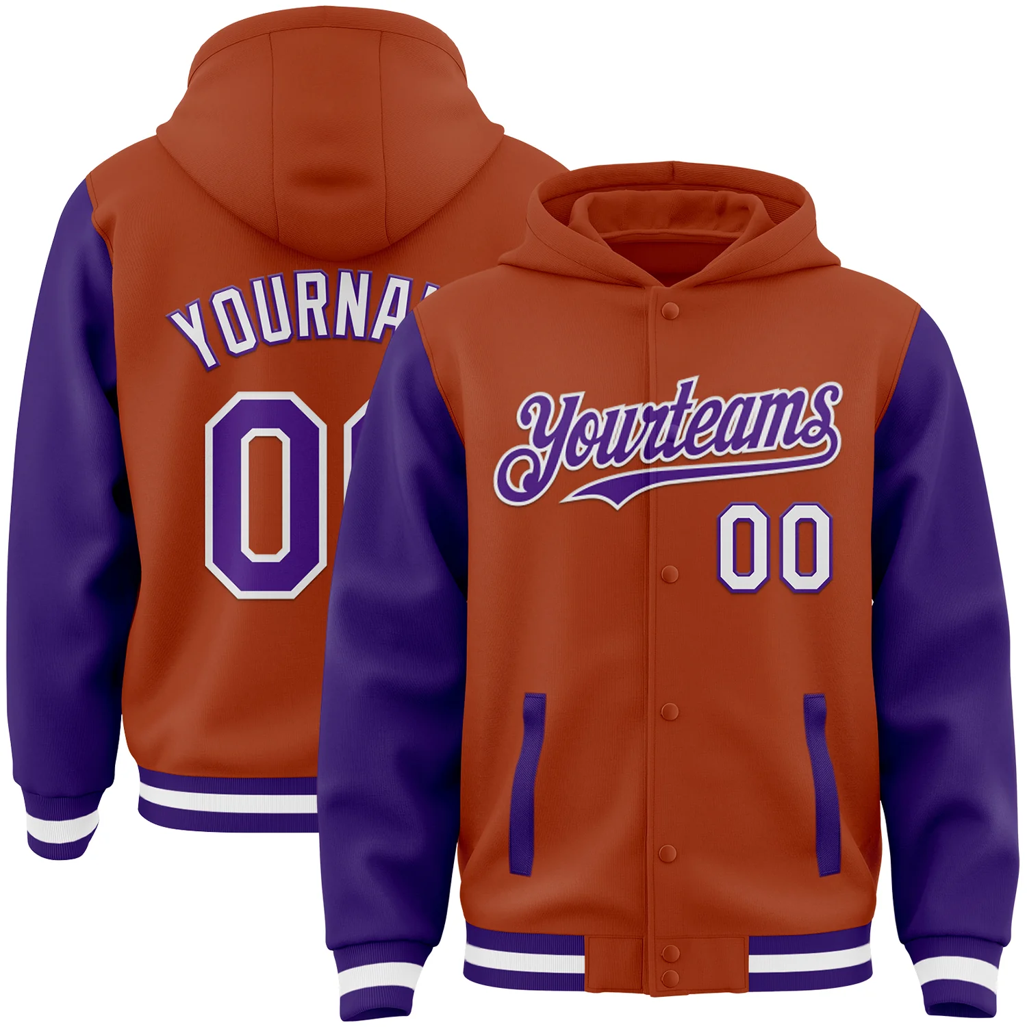Custom Texas Orange Purple-White Bomber Full-Snap Varsity Letterman Two Tone Hoodie Jacket