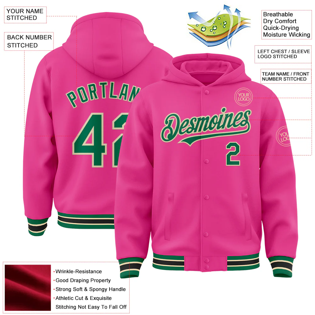 Custom Pink Kelly Green-Cream Bomber Full-Snap Varsity Letterman Hoodie Jacket