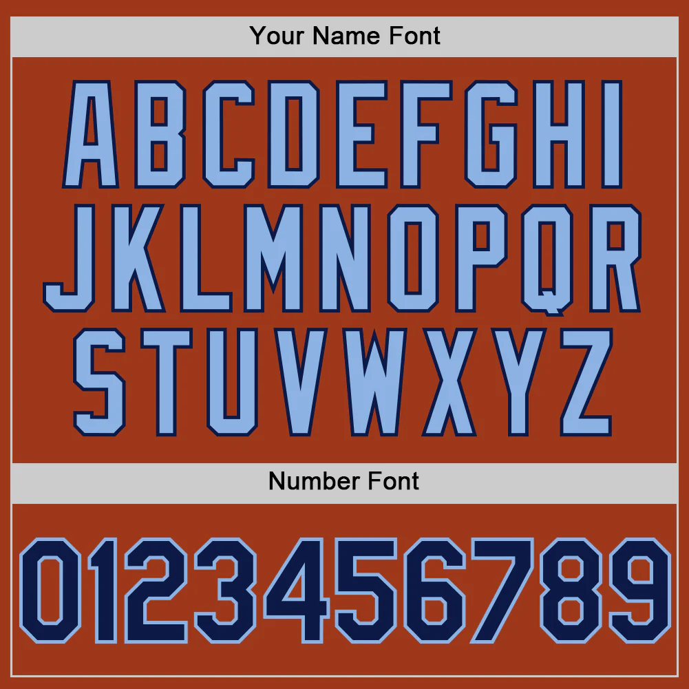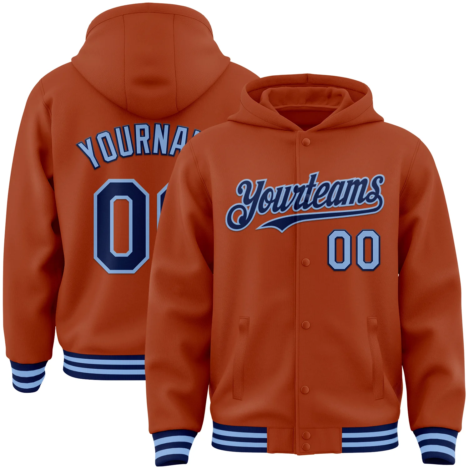 Custom Texas Orange Navy-Light Blue Bomber Full-Snap Varsity Letterman Hoodie Jacket