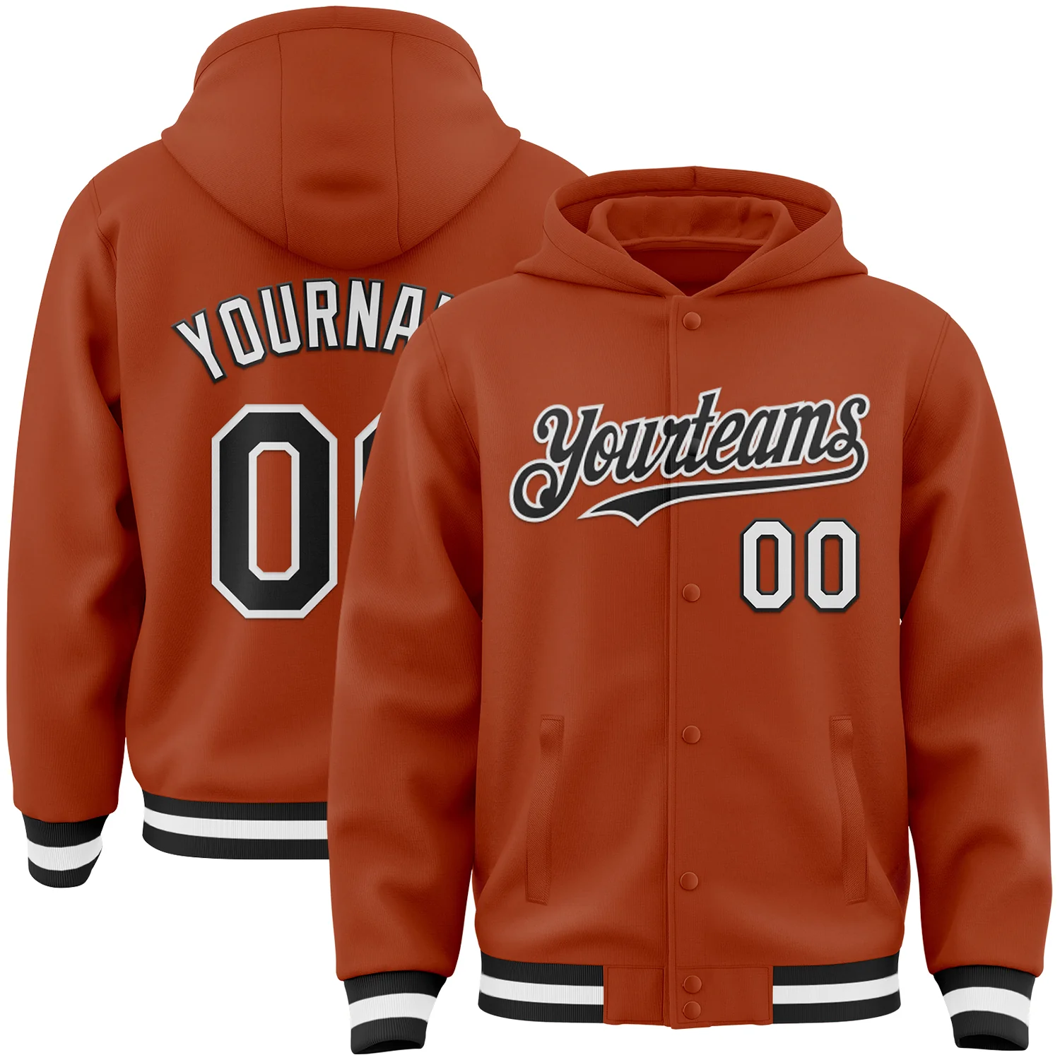 Custom Texas Orange Black-White Bomber Full-Snap Varsity Letterman Hoodie Jacket