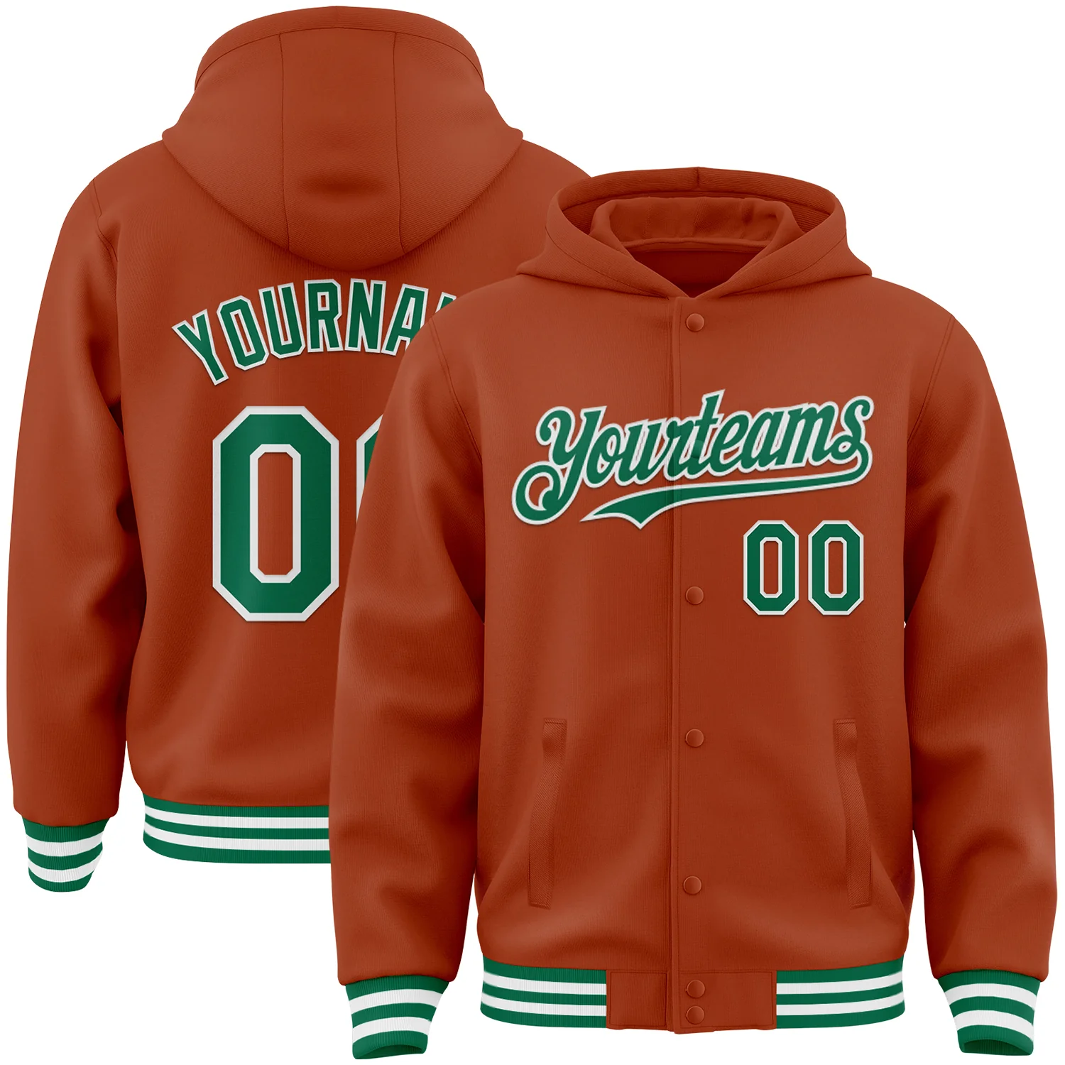 Custom Texas Orange Kelly Green-White Bomber Full-Snap Varsity Letterman Hoodie Jacket