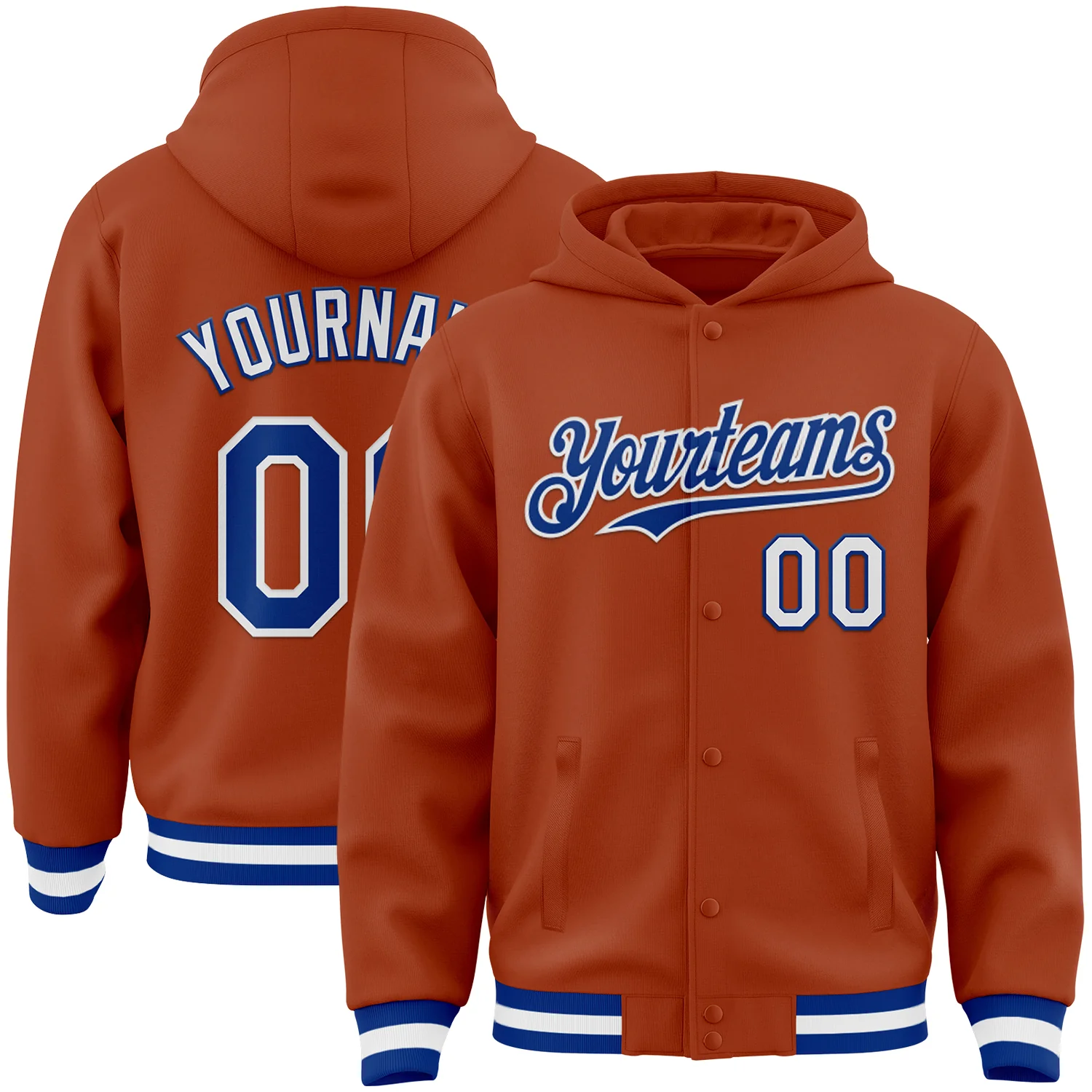 Custom Texas Orange Royal-White Bomber Full-Snap Varsity Letterman Hoodie Jacket