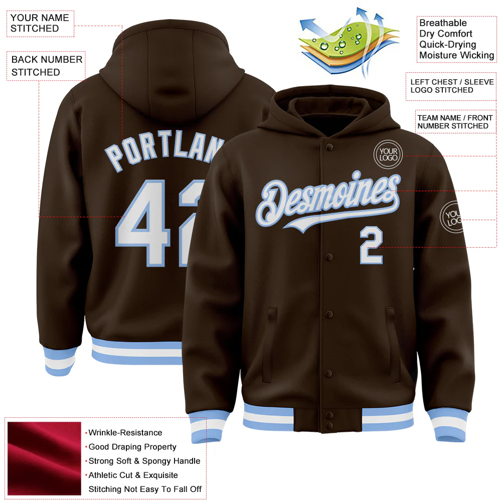 Custom Brown White-Light Blue Bomber Full-Snap Varsity Letterman Hoodie Jacket