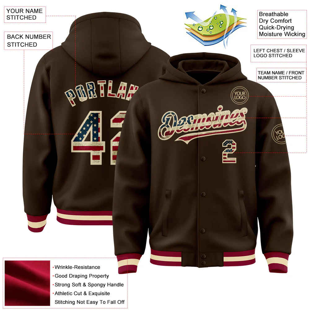 Custom Brown Vintage USA Flag Cream-Maroon Bomber Full-Snap Varsity Letterman Hoodie Jacket