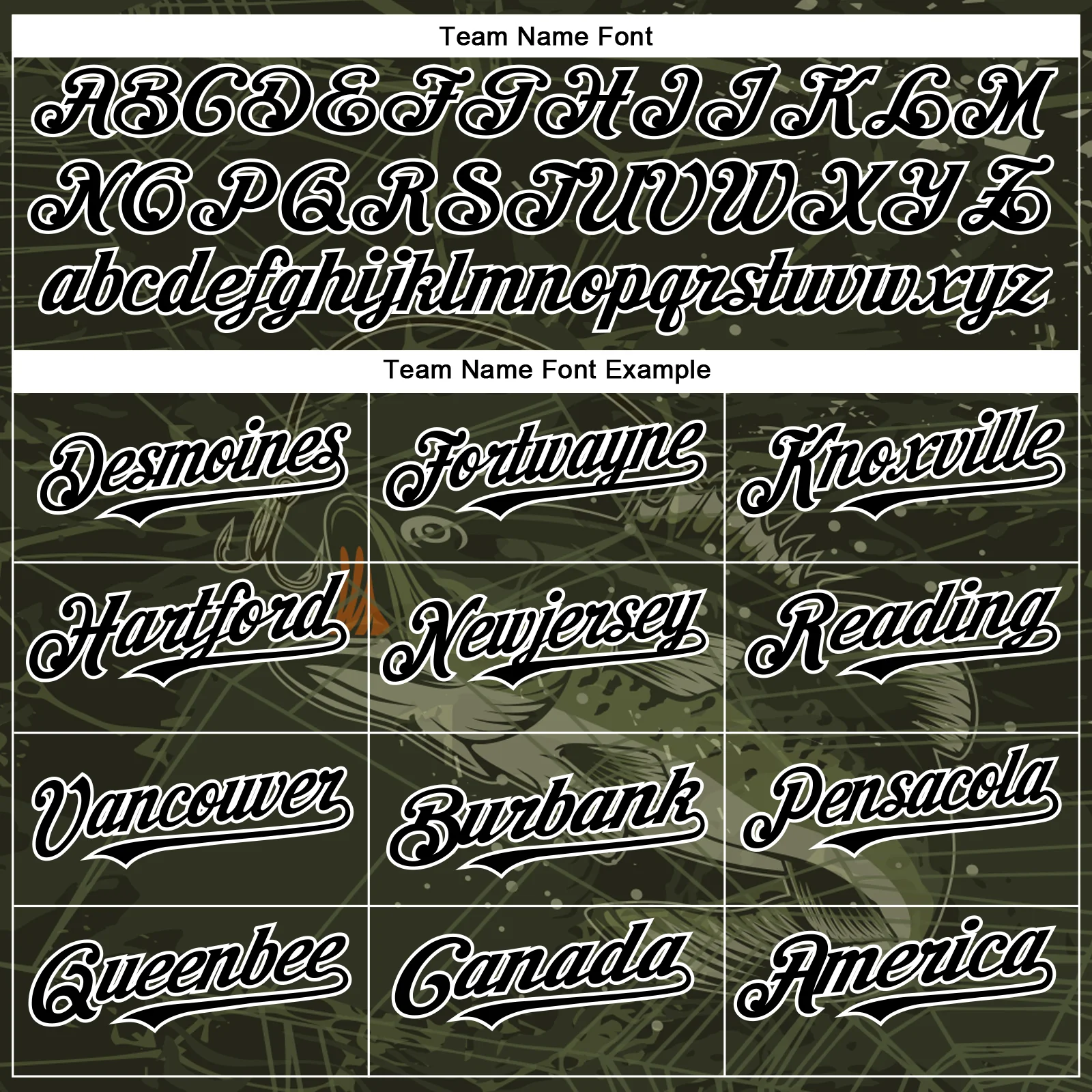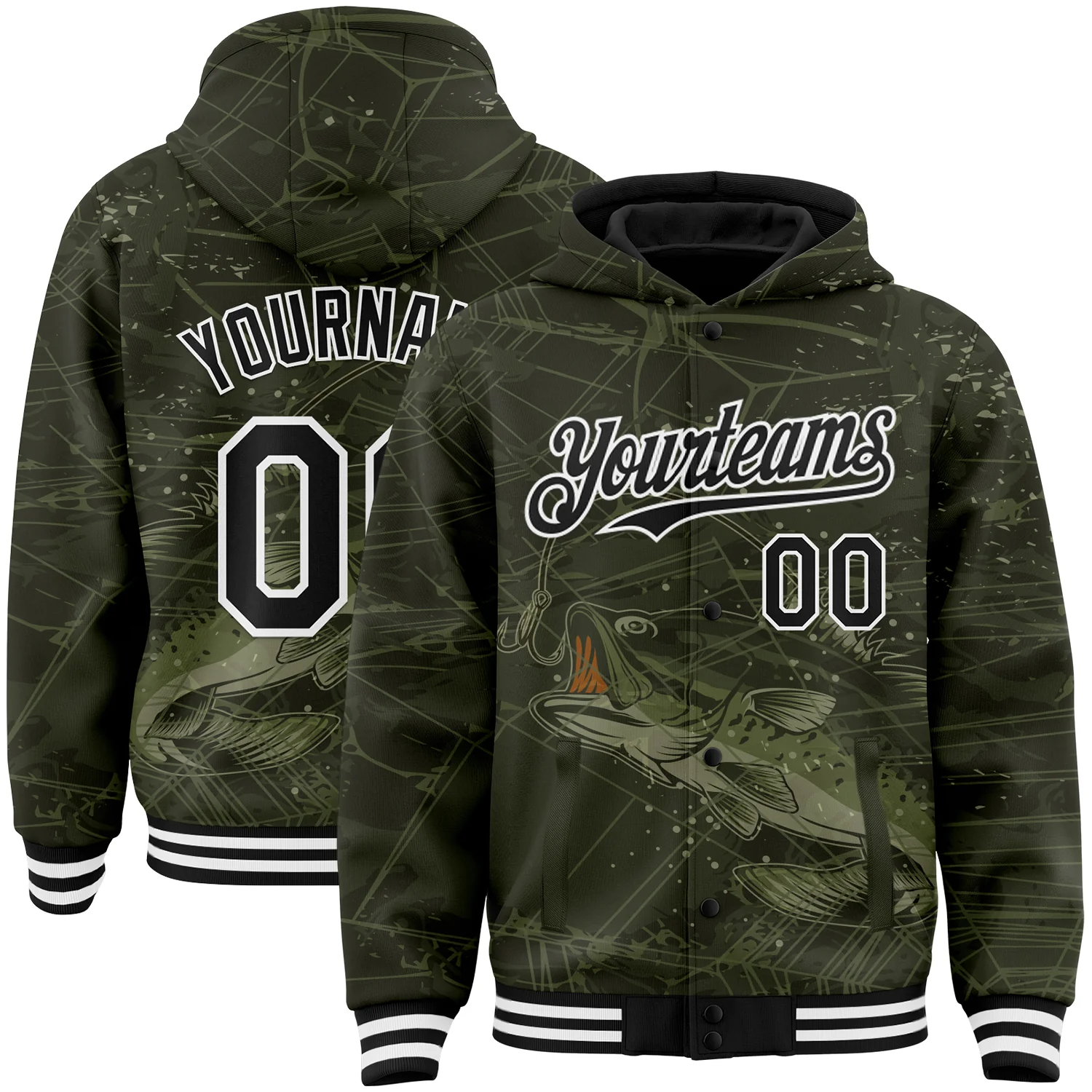 Custom Olive Black-White Largemouth Bass Fish Fishing 3D Bomber Full-Snap Varsity Letterman Hoodie Jacket