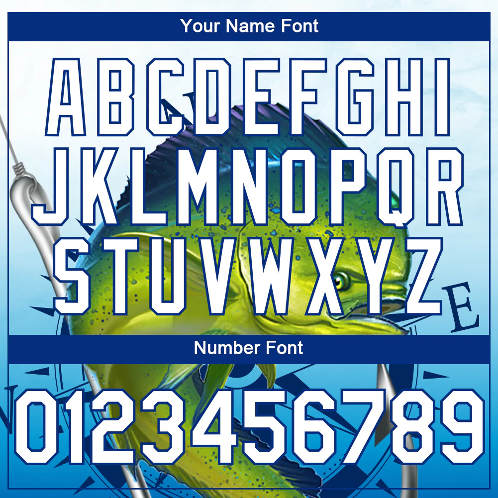 Custom Lakes Blue White-Royal Mahimah Fish Fishing 3D Bomber Full-Snap Varsity Letterman Hoodie Jacket