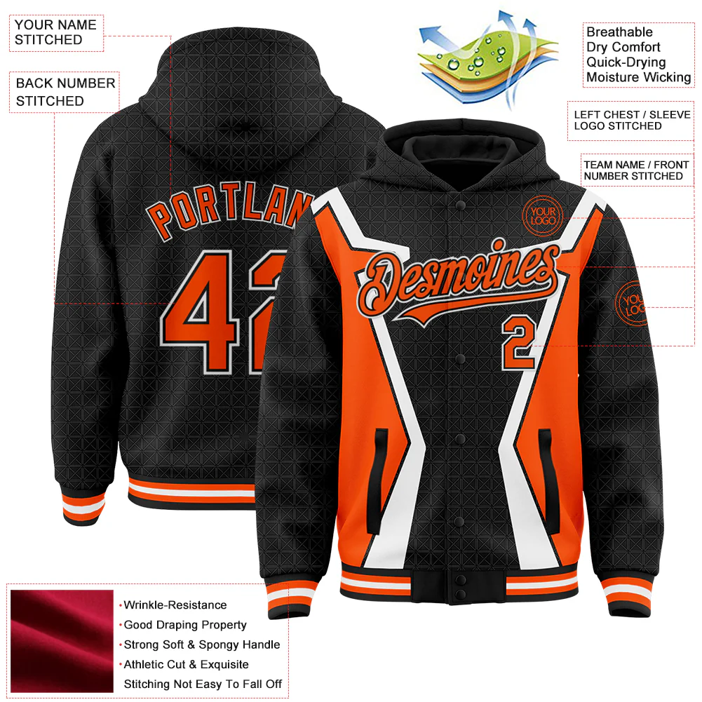 Custom Black Orange-White Arrow 3D Pattern Design Bomber Full-Snap Varsity Letterman Hoodie Jacket