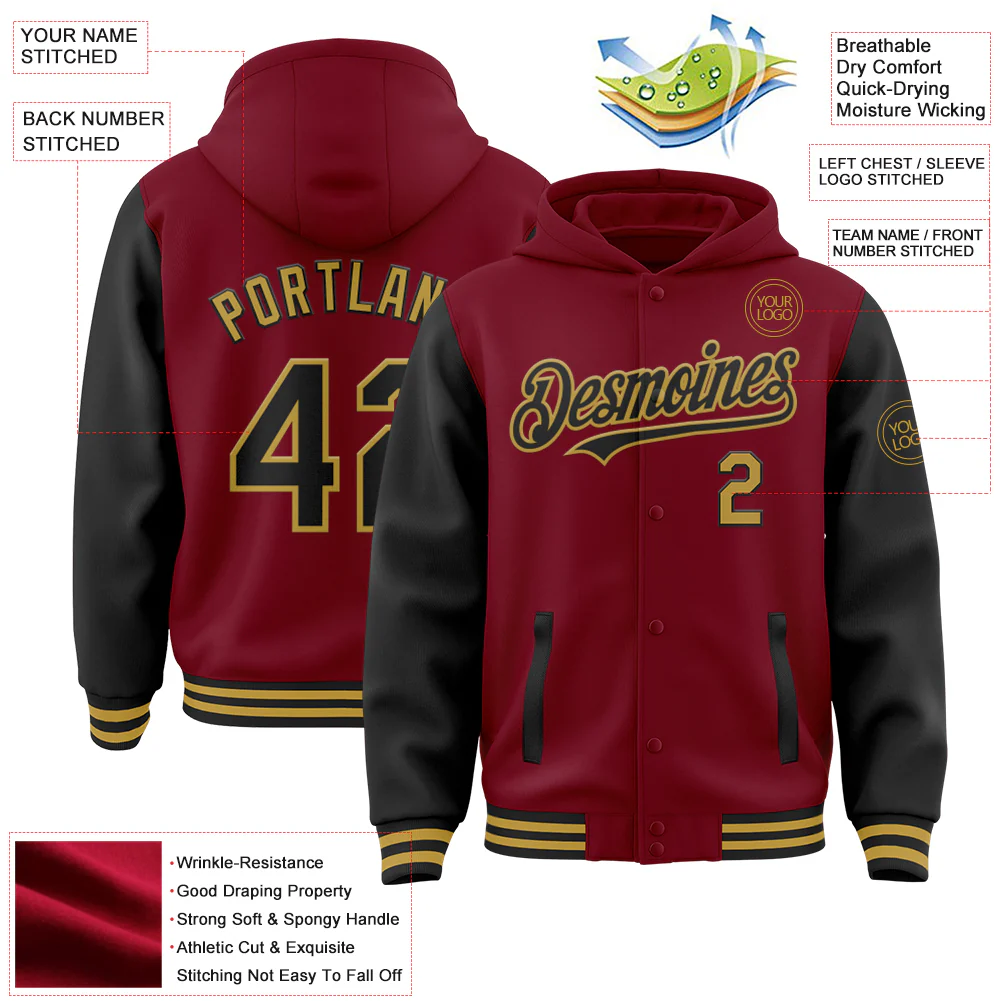 Custom Crimson Black-Old Gold Bomber Full-Snap Varsity Letterman Two Tone Hoodie Jacket
