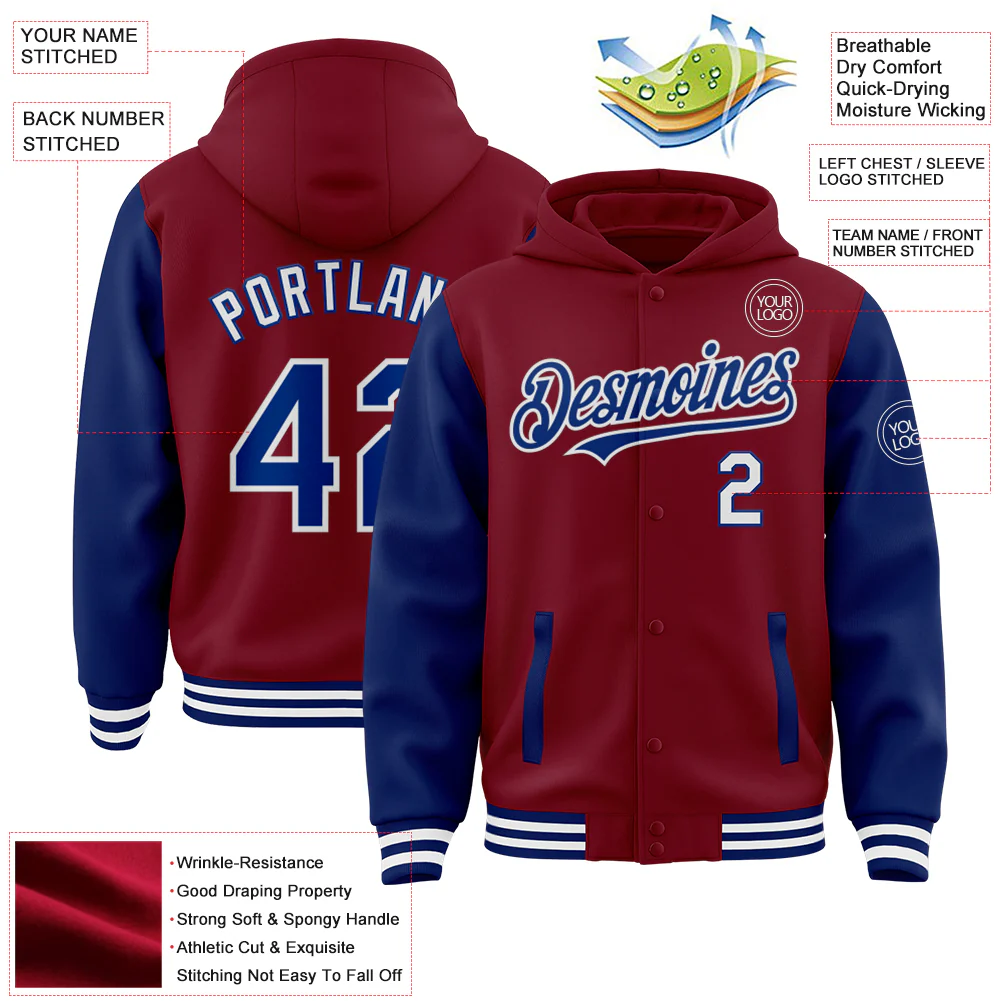 Custom Crimson Navy-White Bomber Full-Snap Varsity Letterman Two Tone Hoodie Jacket