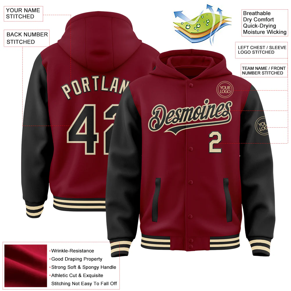 Custom Crimson Black Cream-Gold Bomber Full-Snap Varsity Letterman Two Tone Hoodie Jacket