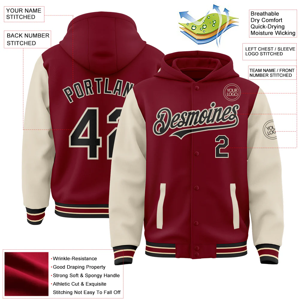 Custom Crimson Black-Cream Bomber Full-Snap Varsity Letterman Two Tone Hoodie Jacket