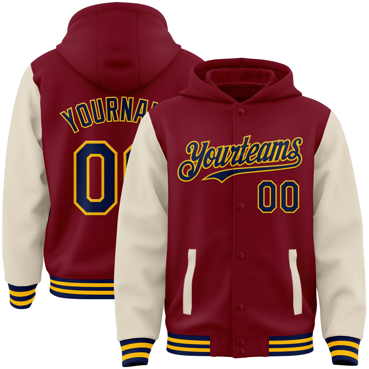 Custom Crimson Navy Cream-Gold Bomber Full-Snap Varsity Letterman Two Tone Hoodie Jacket