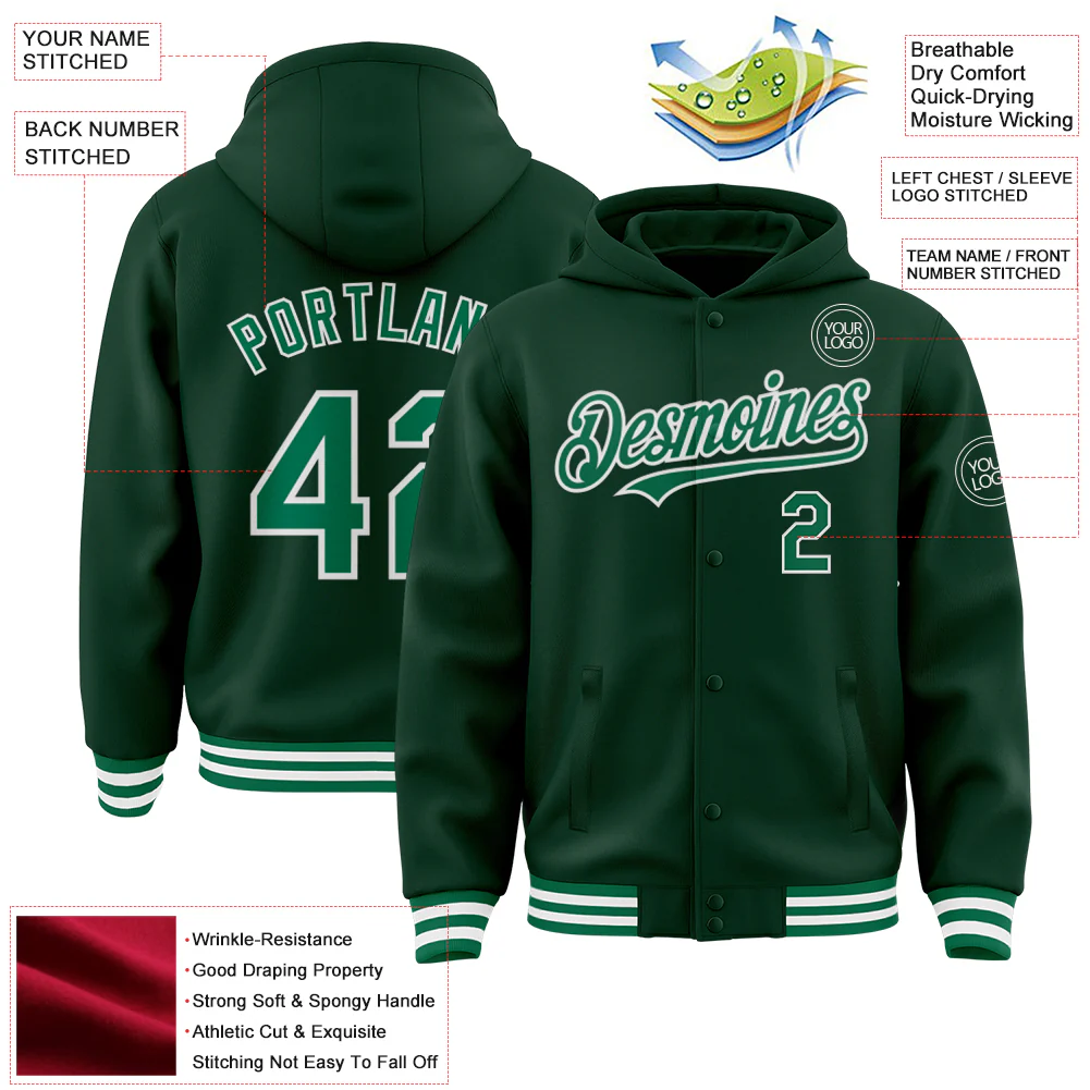 Custom Green Kelly Green-White Bomber Full-Snap Varsity Letterman Hoodie Jacket