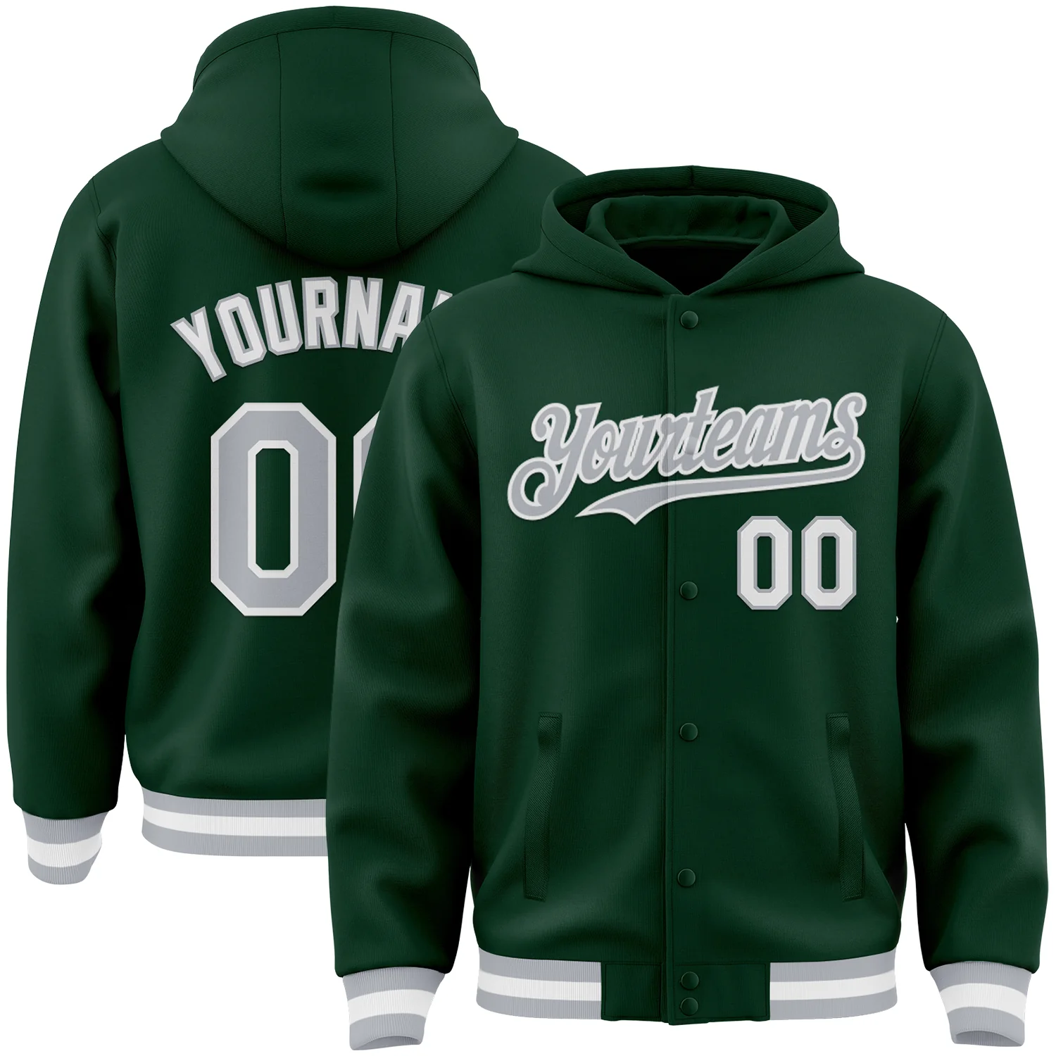 Custom Green Gray-White Bomber Full-Snap Varsity Letterman Hoodie Jacket