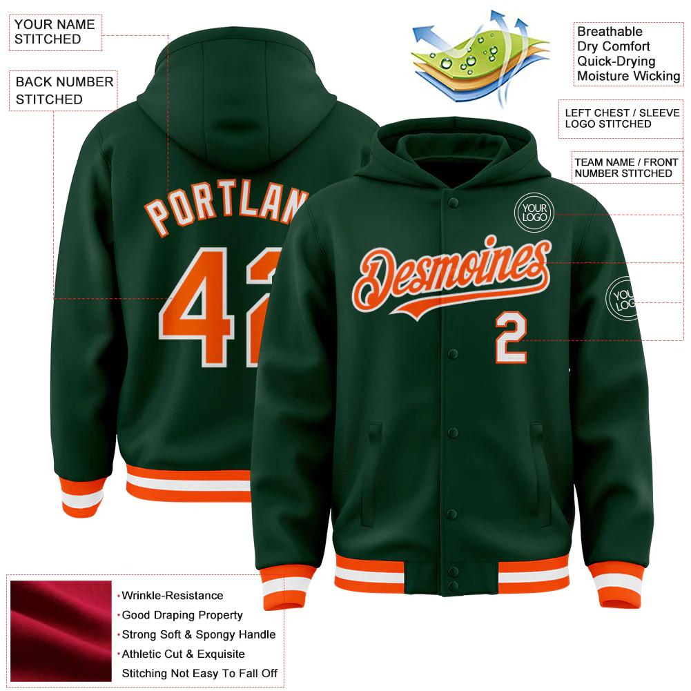 Custom Green Orange-White Bomber Full-Snap Varsity Letterman Hoodie Jacket