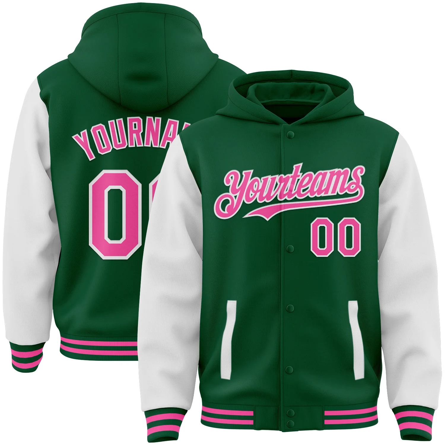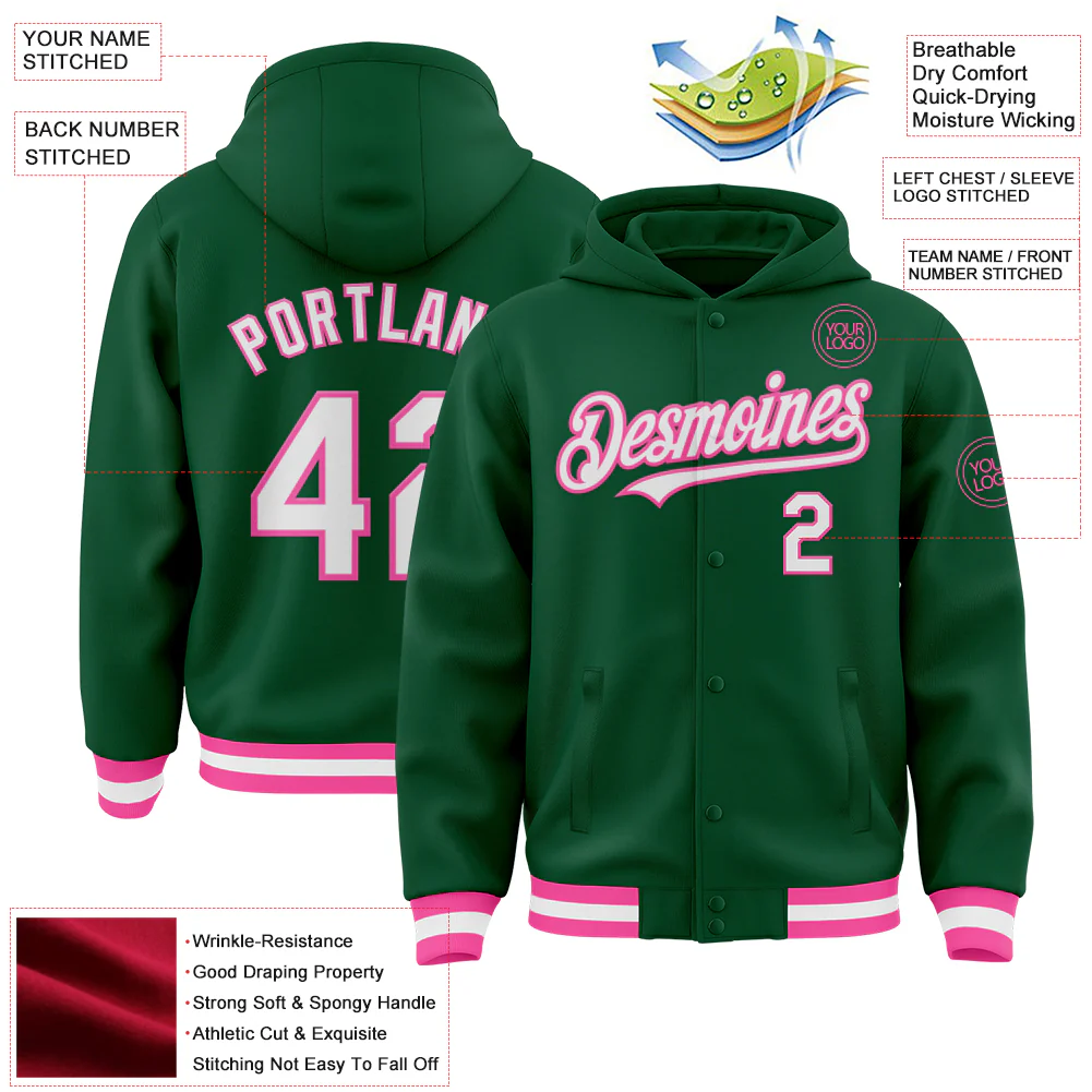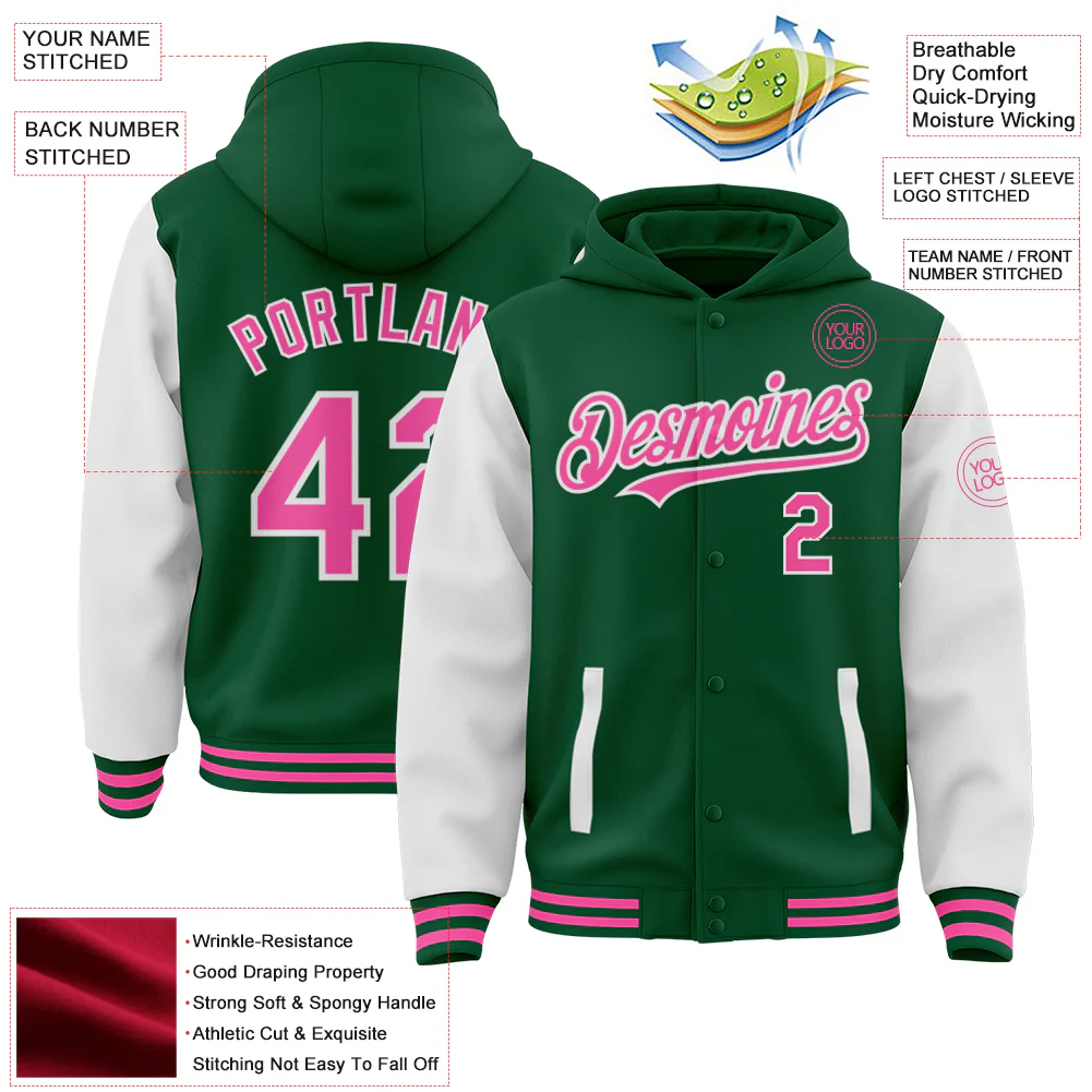 Custom Kelly Green Pink-White Bomber Full-Snap Varsity Letterman Two Tone Hoodie Jacket