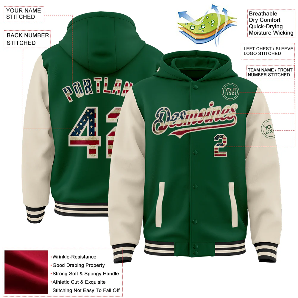 Custom Kelly Green Vintage USA Flag Cream-Black Bomber Full-Snap Varsity Letterman Two Tone Hoodie Jacket