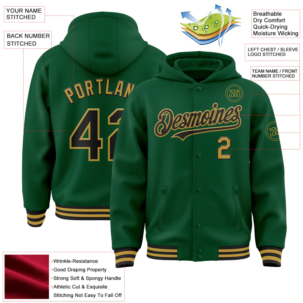 Custom Kelly Green Black-Gold Bomber Full-Snap Varsity Letterman Hoodie Jacket